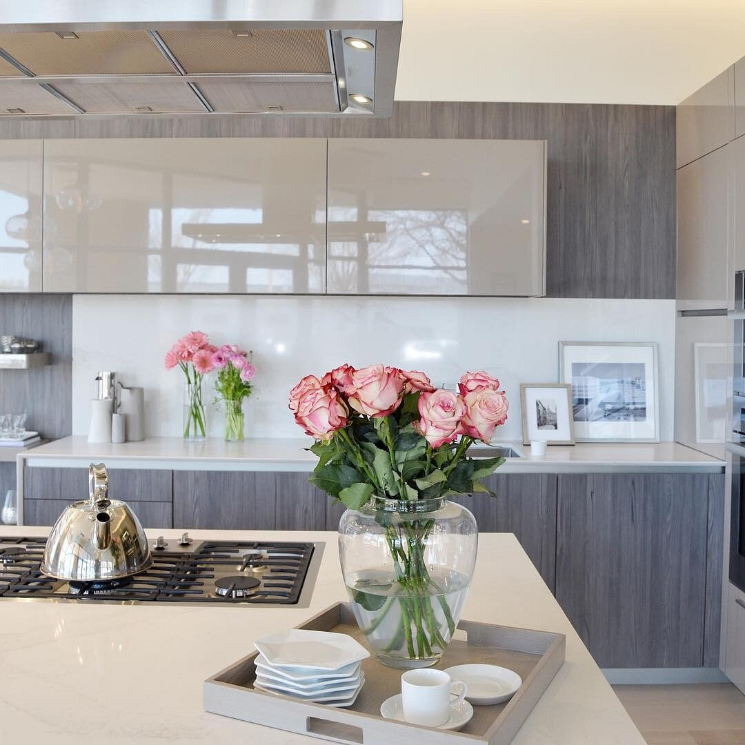 Подвесную часть обычно делают нейтральной. Вот список возможных цветов: белый, шампань, бежевый, песочный, сливочный, молочный, бежево-розовый. Также неплохо смотрятся бледные вариации сиреневого, розового, серого, желтого. Конструкции из такого материала выглядят легкими, а на фоне светлых стен и совсем невесомыми. Иногда, если площадь кухни позволяет, верхние ящики делают яркими. Например, оранжевыми или салатовыми. Их сочетают с черным или холодным коричневым тоном. В этом случае декора должно быть немного — штор, пледа и ваз с цветами вполне достаточно, так как внимание к себе притягивает гарнитур. Отделка потолка, стен и пола должна быть нейтральной.