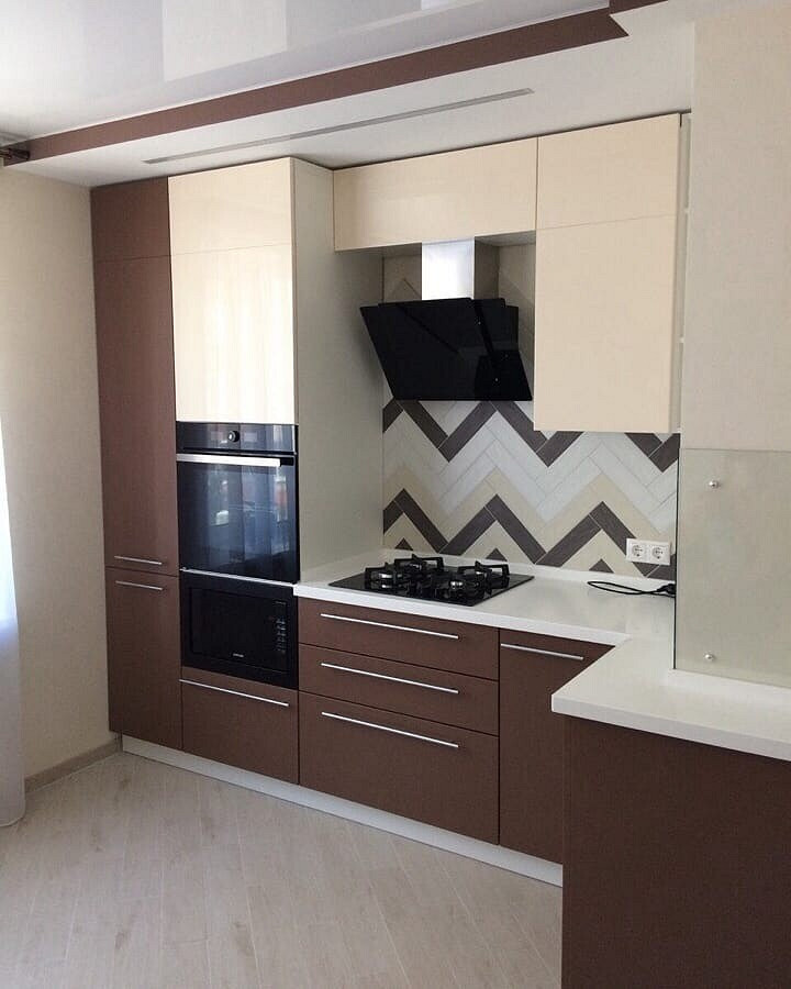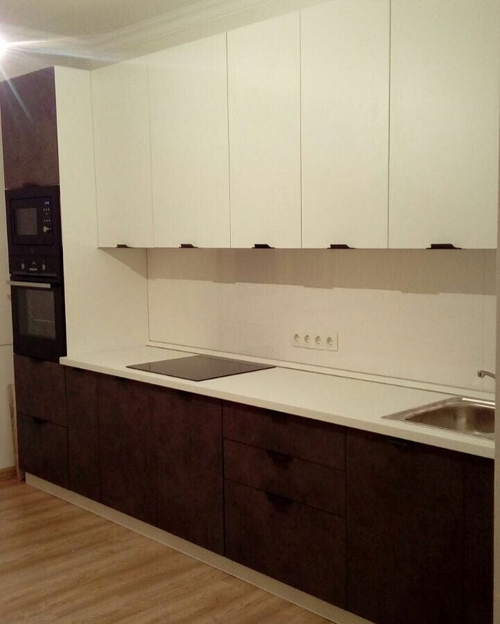 Это может быть очень темный венге, эбеновое дерево, менее насыщенный орех, яркий дуб или другая расцветка из палитры. В комбинации с бежевыми тонами, каждый из этих оттенков расширяет пространство, смотрится просто, но красиво и элегантно. Белоснежные верхние шкафы, особенно с глянцевым фасадом, добавят в интерьер больше строгости и динамики — идеальный вариант для хай-тек стиля. Если классические сочетания не для вас — обратите внимание на розовый и серый. Они также подходят к коричневому.