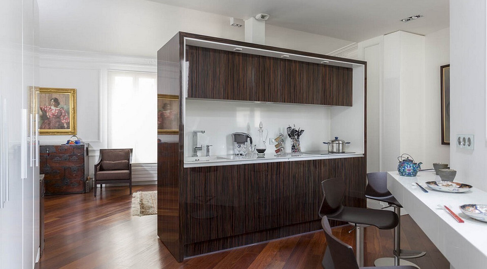 Массивные кухни-колонны — не вариант для небольших квартир. Но как быть тем, кто действительно любит готовить, нужно достаточно места для хранения и хорошей встроенной техники? Решение — встроить всю кухню в стену, правда для этого придется предусмотреть капитальный ремонт.