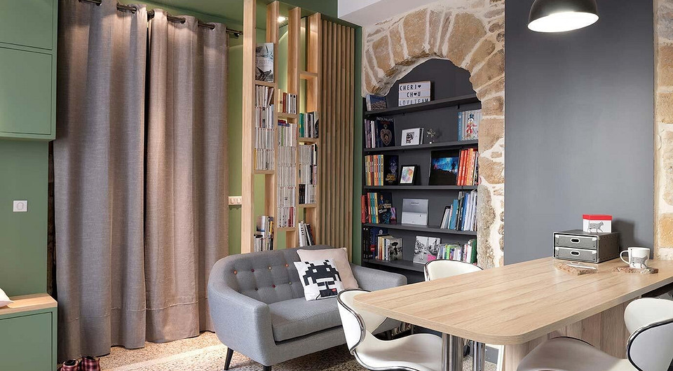 В совсем маленьких квартирах строить глухие перегородки — не всегда хорошее решение, но все же визуально зонировать пространство хочется. И тогда можно использовать вот такое решение — полуперегородка. Она может стать еще и дополнительной полкой.