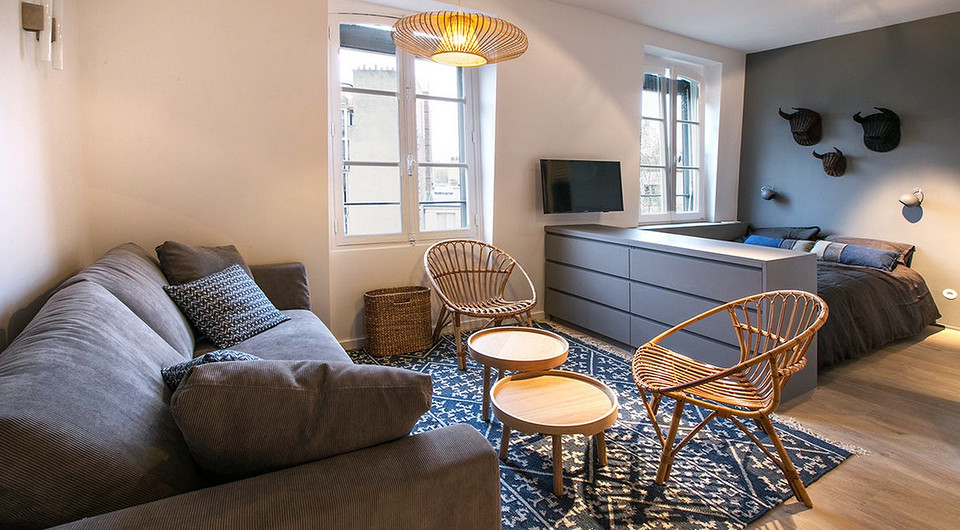 Вопросы зондирования — одни из самых сложных, поэтому мы не устаем про них писать и рекомендовать интересные решения. Как видите, во Франции тоже они есть. Здесь кровать отделили полупрозрачными дверями-купе. С первого взгляда даже может показаться, что за ними скрыта гардеробная или это просто большой шкаф.