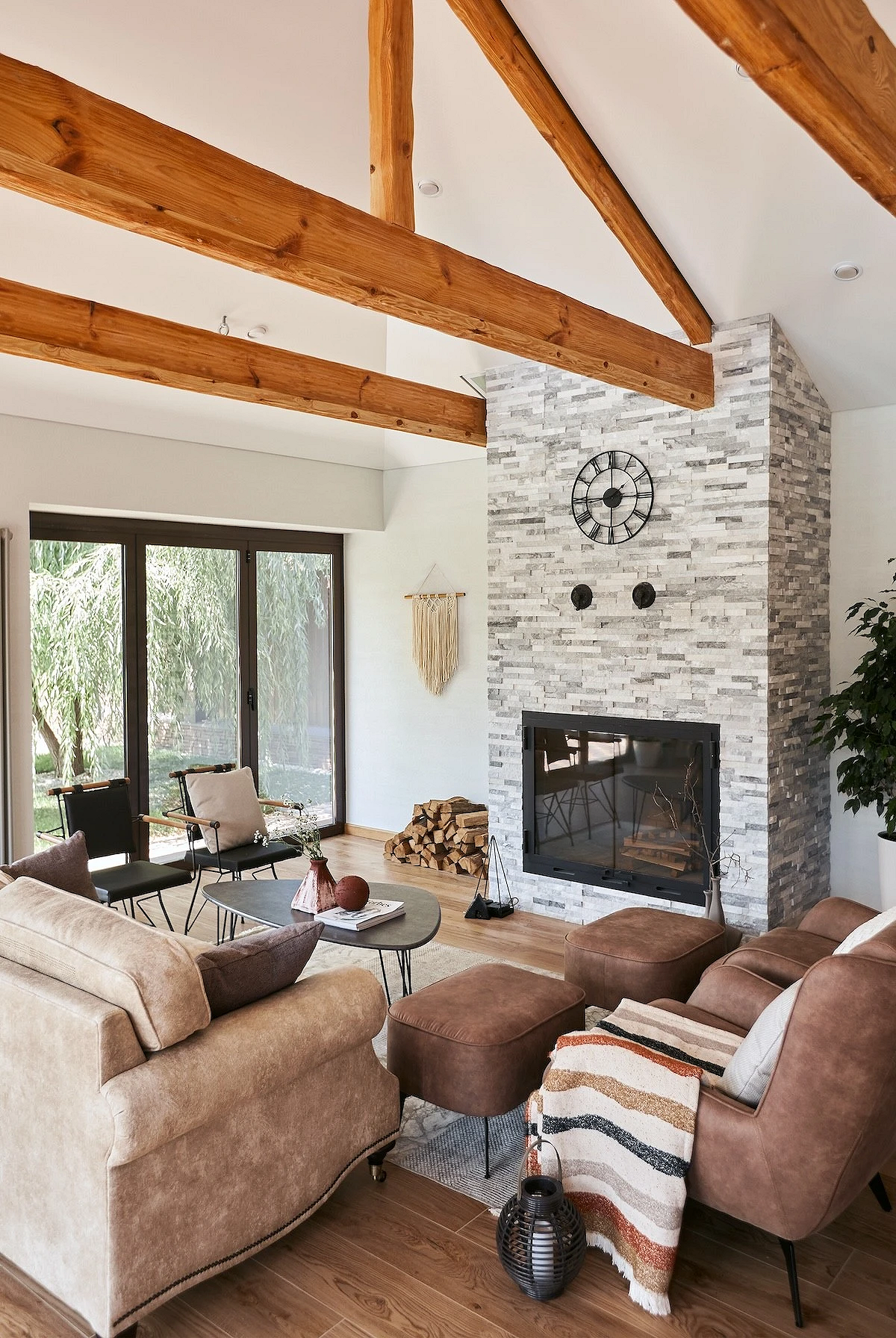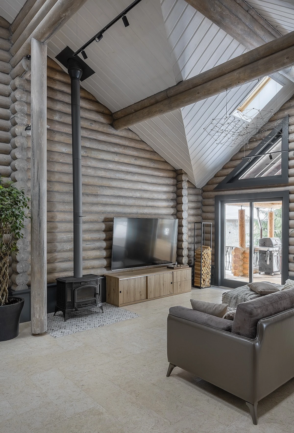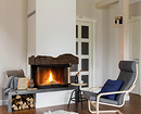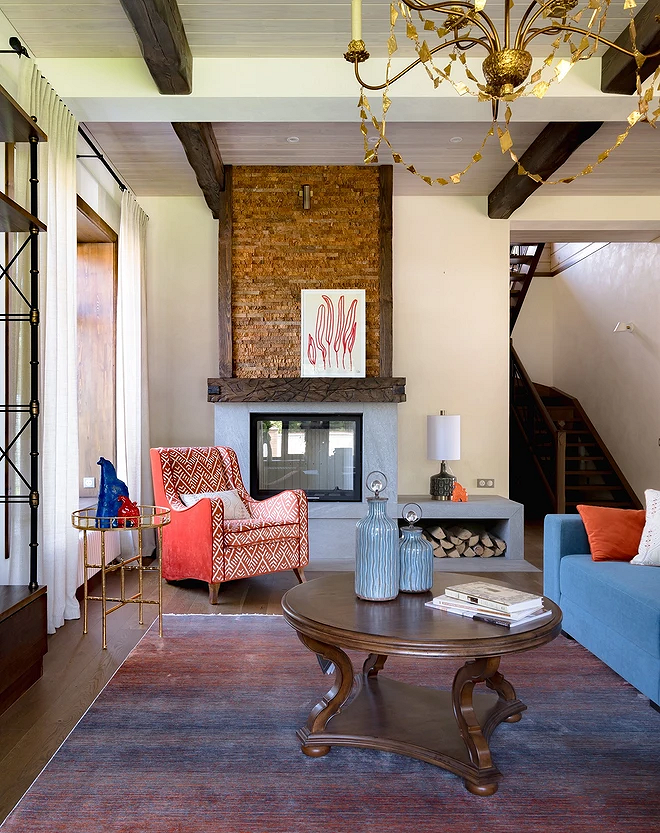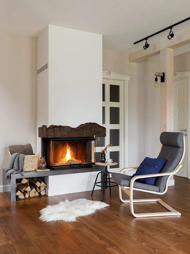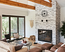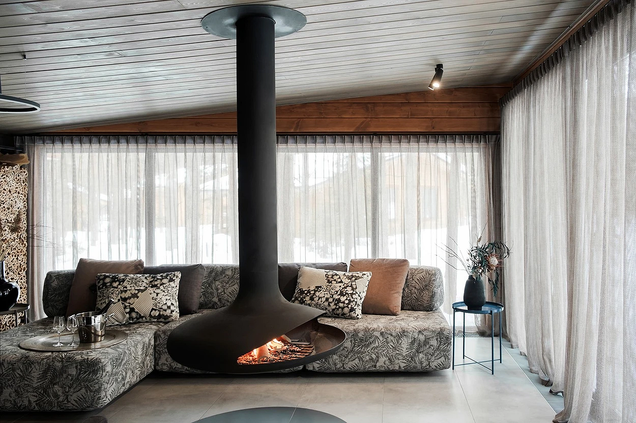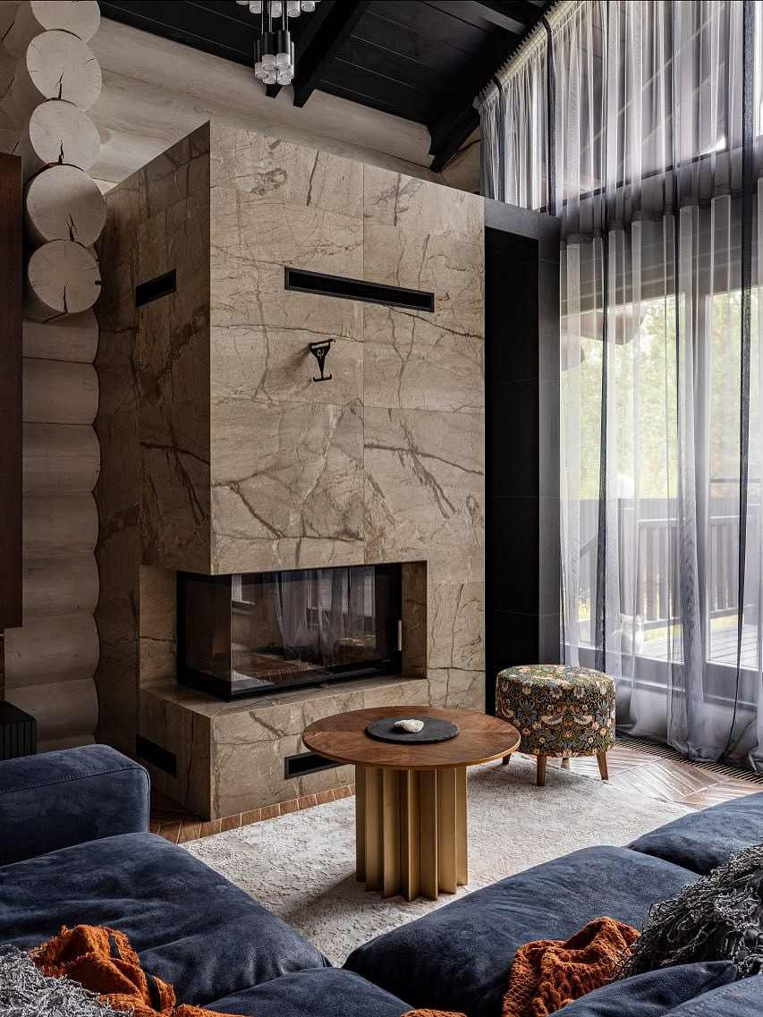 - Камин — это традиционный и важный элемент шале. Даже в современной интерпретации он остается композиционным центром гостиной.