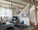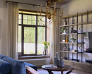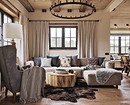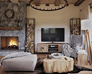Это сердце дома, место отдыха и общения. В оформлении применяются все основные принципы стиля: от материалов до цветовой гаммы. Зону отдыха, как правило, строят вокруг дивана и камина (можно обойтись и без него, но очаг добавляет уюта) — настоящего или современного электрического. Фальшкамин тоже допустим.
