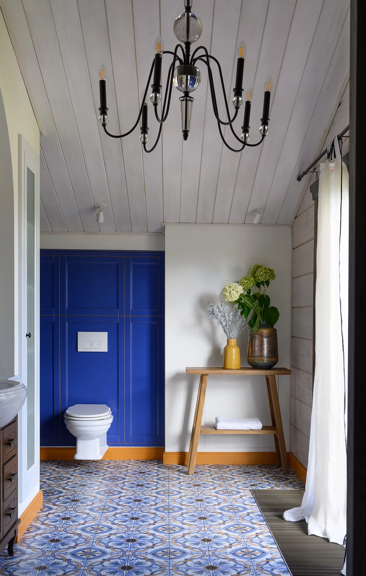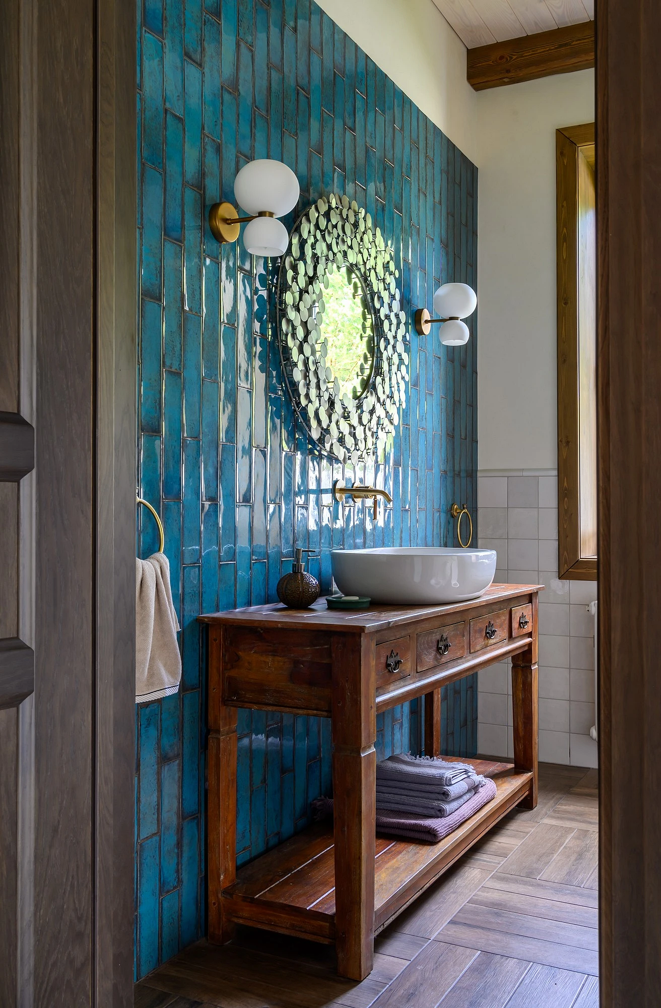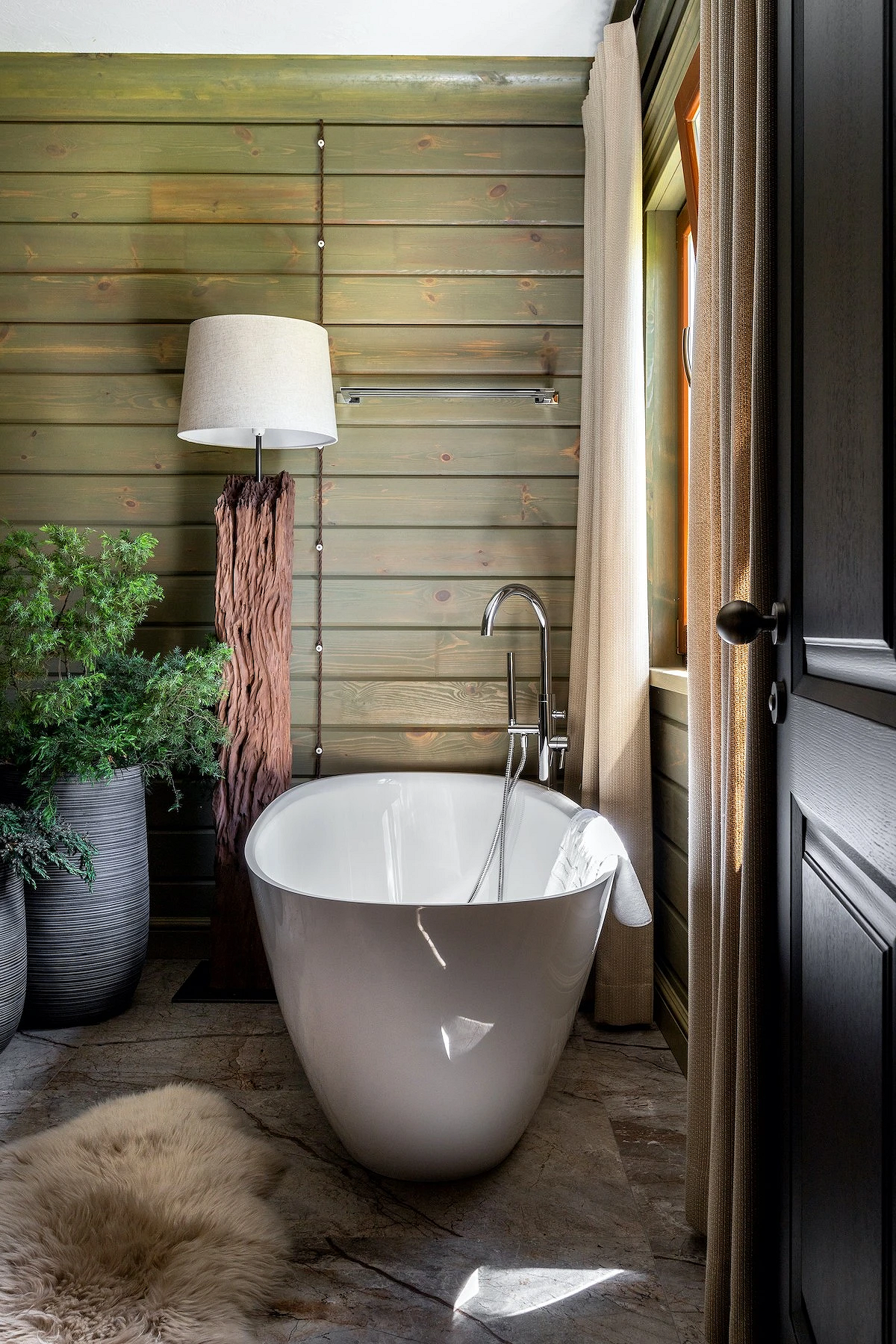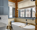 Оформить ванную в стиле шале сложнее, чем жилые комнаты. Традиционно дерево не «дружит» с влагой, поэтому в санузле в основном применяют имитации: керамогранит, плитку, кварцвинил с соответствующим финишем. Древесину дополняют фактурой камня, металлическими и стеклянными деталями.