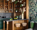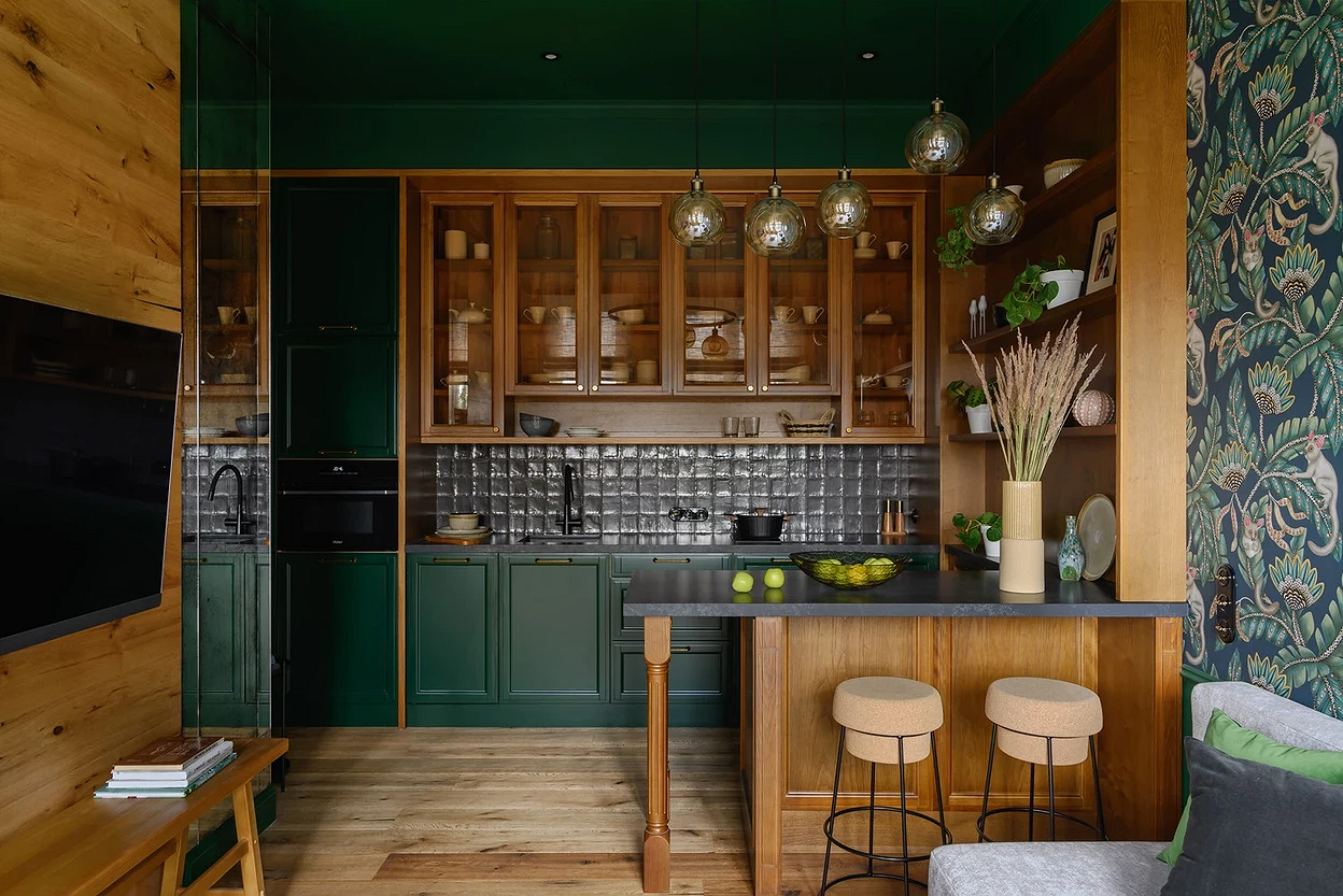 Кухня в стиле шале должна выглядеть теплой и домашней, даже если она современная по планировке и основным дизайн-решениям. Для гарнитура подойдут деревянные матовые фасады в природных оттенках или пастельных тонах. Можно частично или полностью отказаться от верхних шкафов, заменив их рядами полок с декором и посудой. Столешницу делают под камень или все то же дерево. Фартук может быть продолжением общего фона или ярким акцентом — в этом случае выбирают цветную плитку возможно, с ненавязчивым узором.