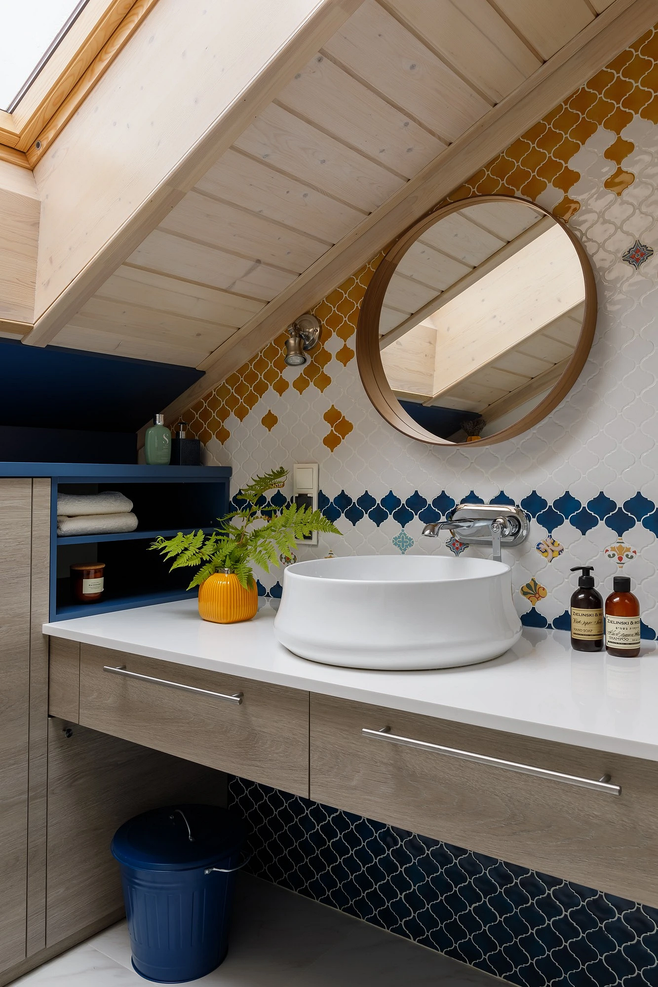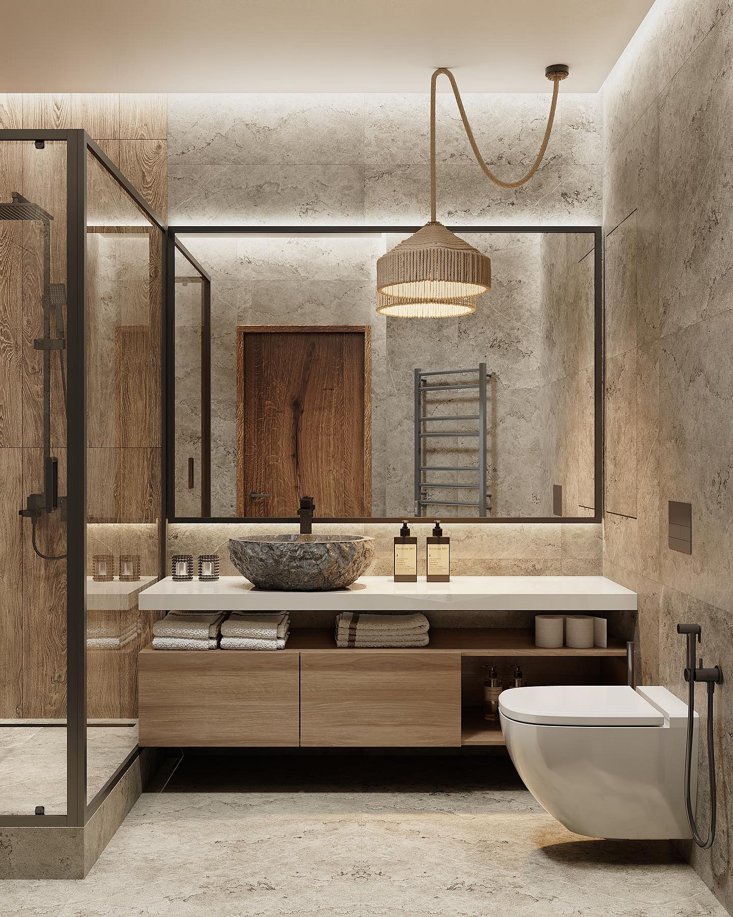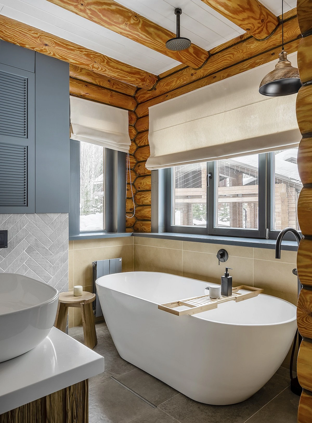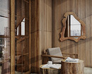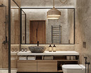 Основная идея — ванная должна напоминать спа-зону в отеле на горнолыжном курорте или уютном коттедже в горах. При оформлении нужно ориентироваться на это ощущение, активно использовать текстиль, декор и освещение. Если есть возможность, поставить отдельную ванну-чашу, возможно, у окна. Цветовая гамма помещения — теплая, в бежево-коричневых тонах, которые часто разбавляют белым или светло-серым.