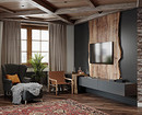 Дерево и камень нужно дозировать, особенно если площадь небольшая. Эти материалы лучше применять акцентно, для отделки некоторых стен и пола, отдельных предметов мебели. Традиционные для шале балки на потолке можно заменить имитацией или вовсе отказаться от них, особенно в типовой квартире. Камень будет уместно смотреться в зоне ТВ, на кухонном фартуке, в прихожей и ванной. Мебель для квартиры может быть менее массивной, чем для дома. Она не должна «съедать» пространство и мешать проходу. Формы — простые, но без ощущения тяжеловесности, цветовая гамма — все так же природная.