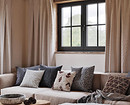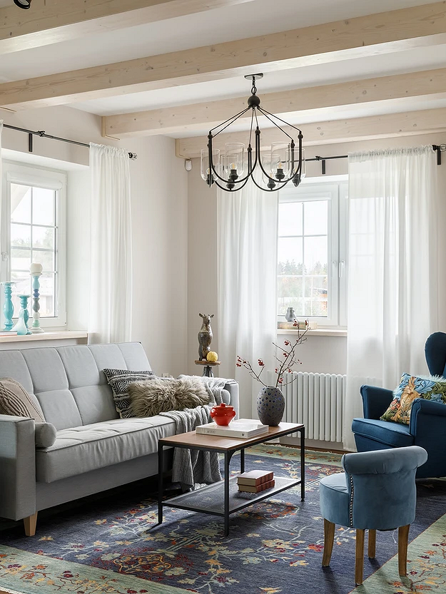 Текстиль — один из главных способов создания уюта в «пастушьем» доме. В первую очередь это ковры, шторы и пледы из качественных тканей. Ковры лучше выбирать с высоким ворсом или шерстяные, в спокойной гамме без ярких орнаментов. Шторы — из плотной ткани, с мягкими складками, длиной в пол. Хорошо смотрятся лен, хлопок, смесовые ткани, иногда — имитация шерсти. Тюль используют реже, но если он нужен, то выбирайте матовый, без блеска и вышивки.