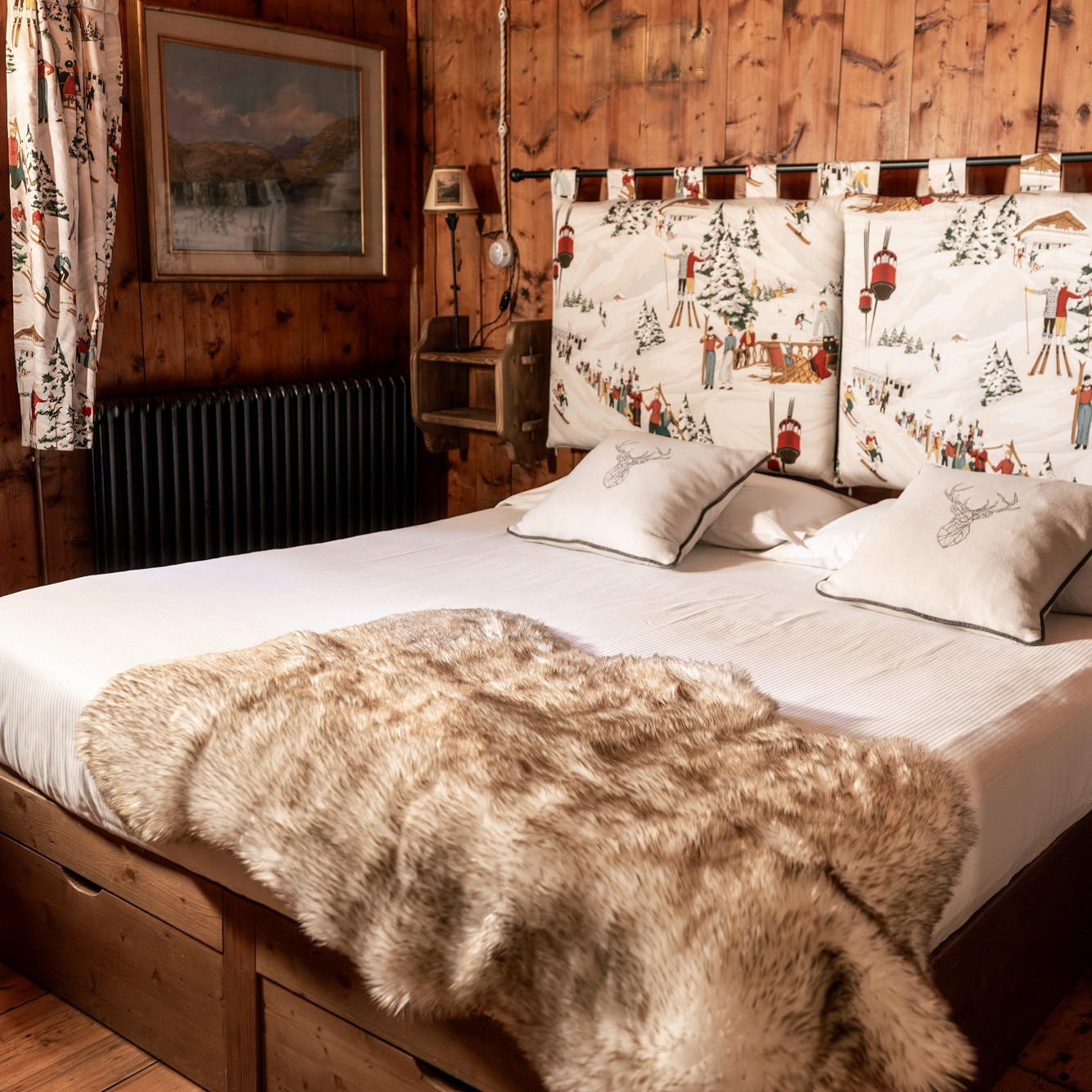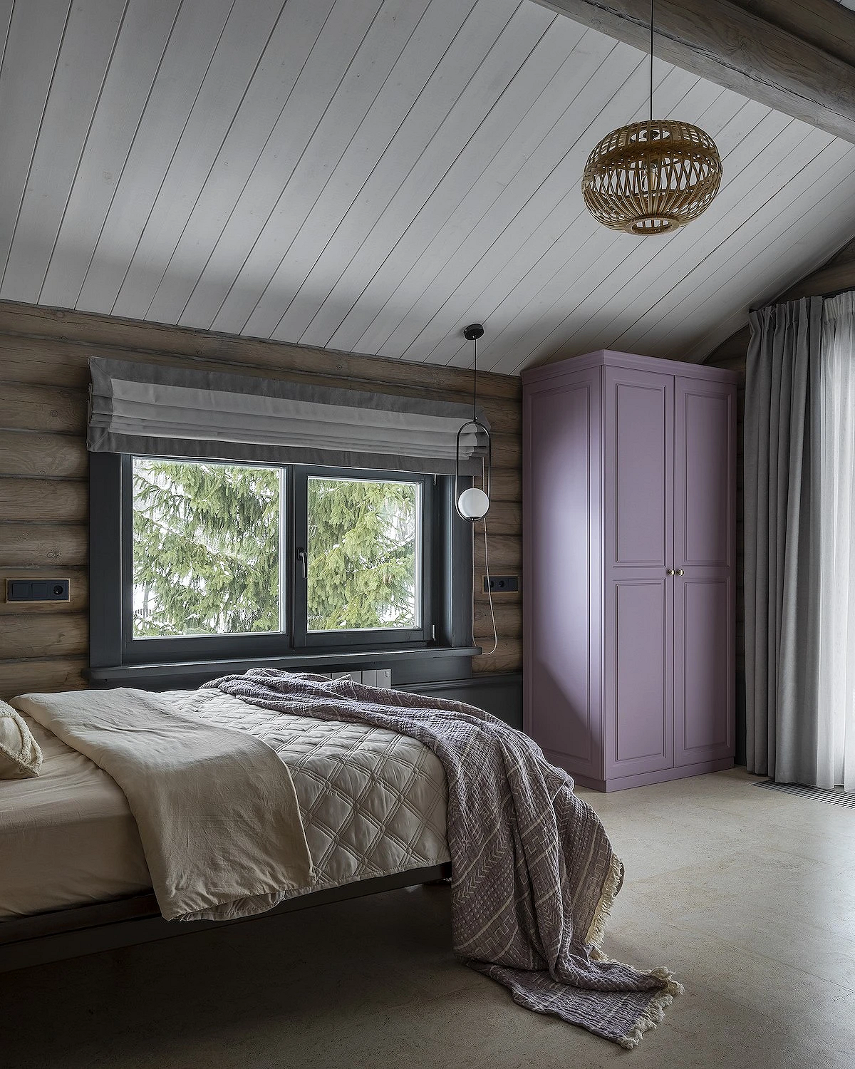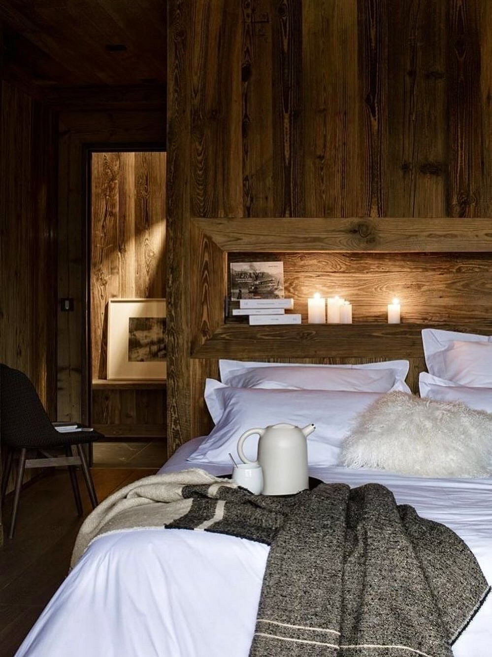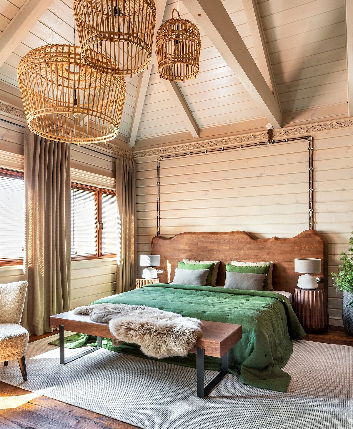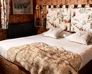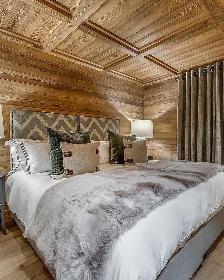 Интерьер спальни в стиле шале важно не перегружать деталями, чтобы комната на 100% располагала к отдыху. Основной акцент делают на кровать: она должна быть большой, с деревянным, кованым или мягким изголовьем в нейтральной обивке. В этом случае можно не бояться того, что мебель будет выглядеть массивной или тяжелой — это только плюс.