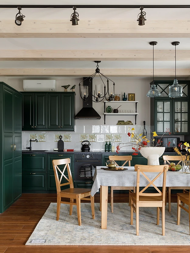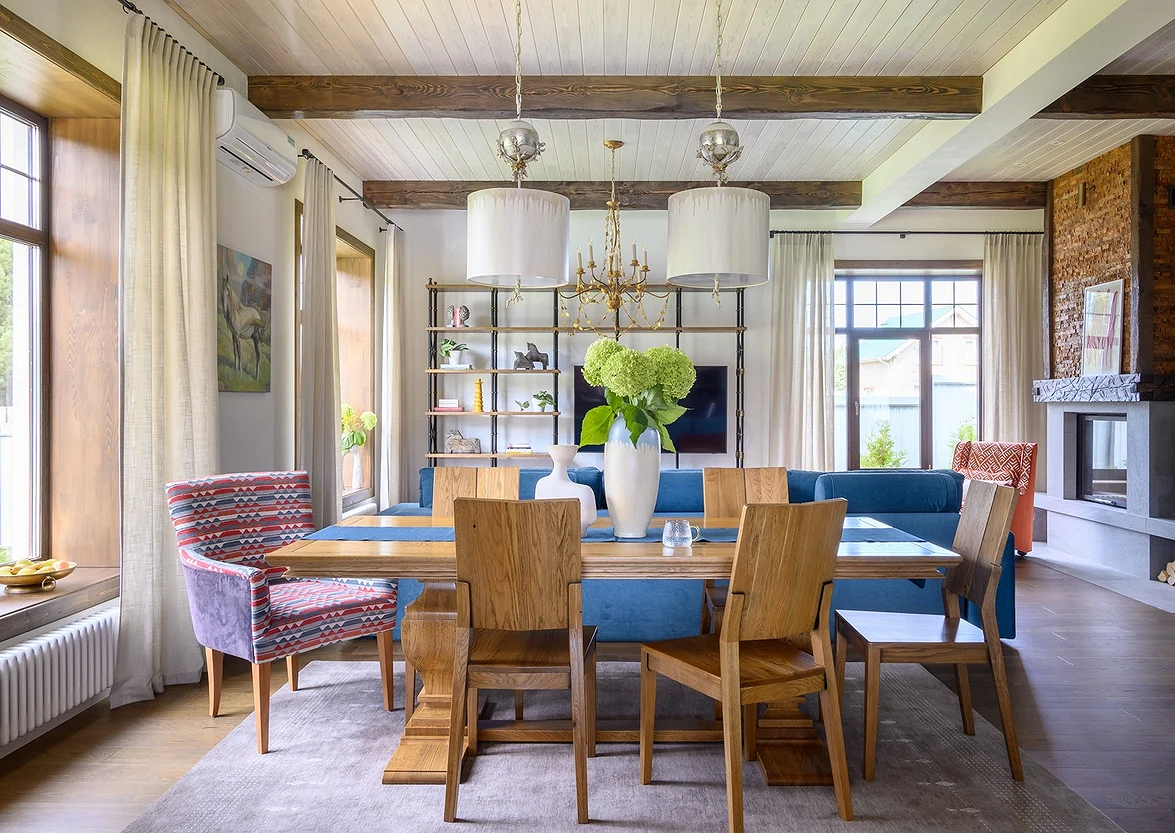 Обеденная зона, если она на кухне, становится главным элементом. Стол должен быть большим, с устойчивыми ножками, обязательно из дерева или его максимально достоверного аналога. Стулья — деревянные или мягкие, здесь строгих правил нет. Для столовой группы нужно продумать отдельное освещение: люстру или подвесной светильник.