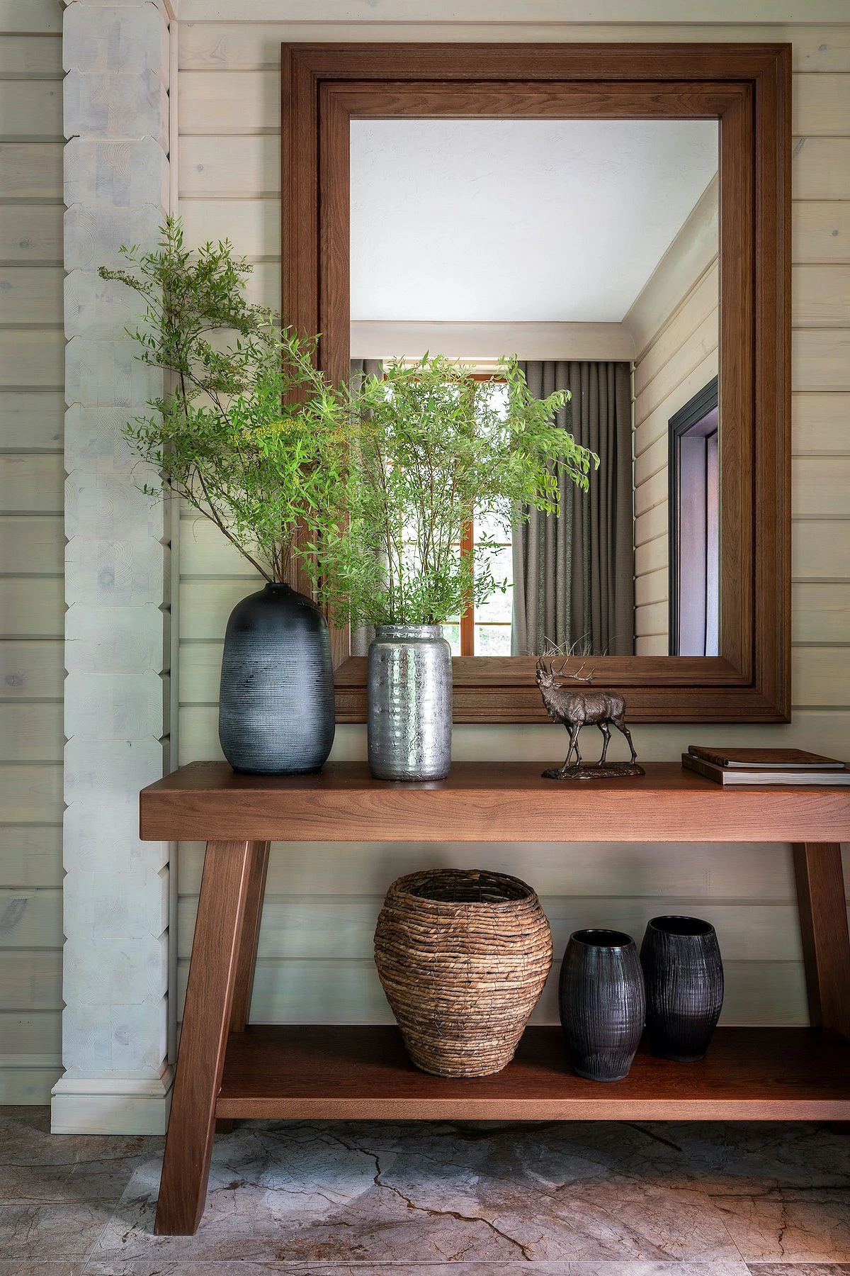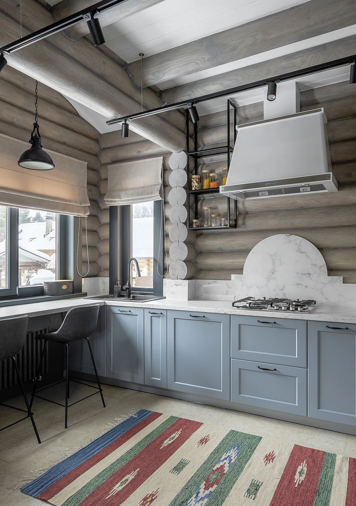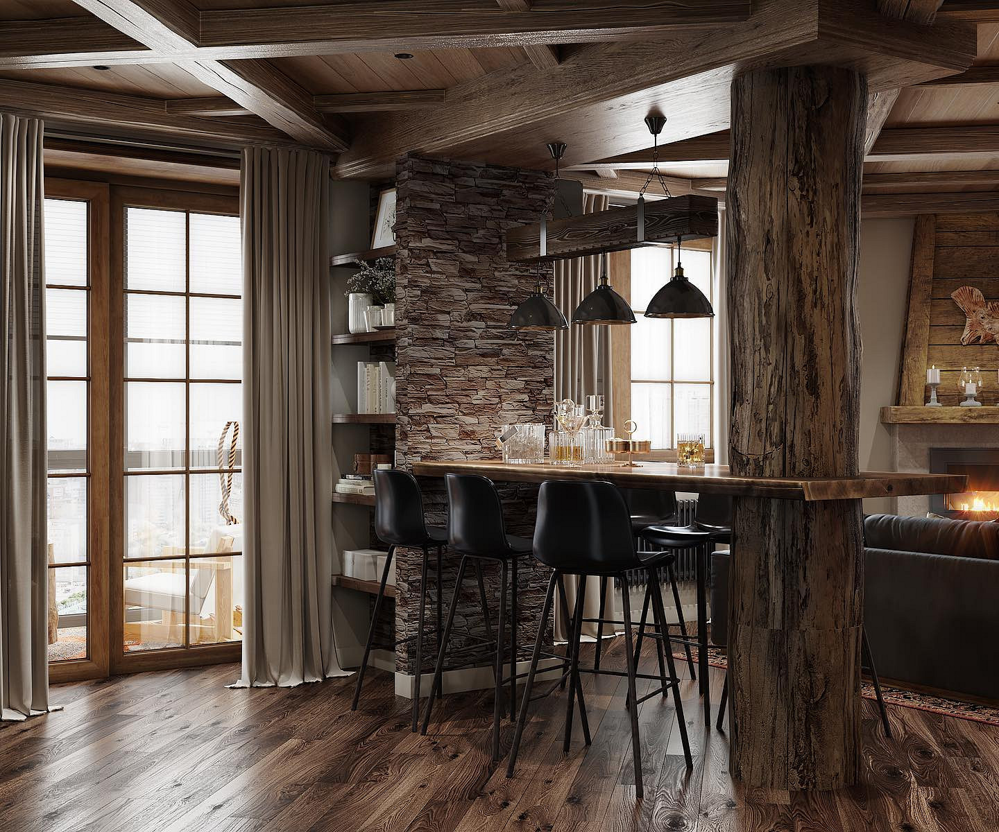 - Массивные конструкции — балки, толстые перекрытия и основательная мебель создают ощущение надежности. Даже декоративные элементы выглядят так, будто выполняют конструктивную функцию.