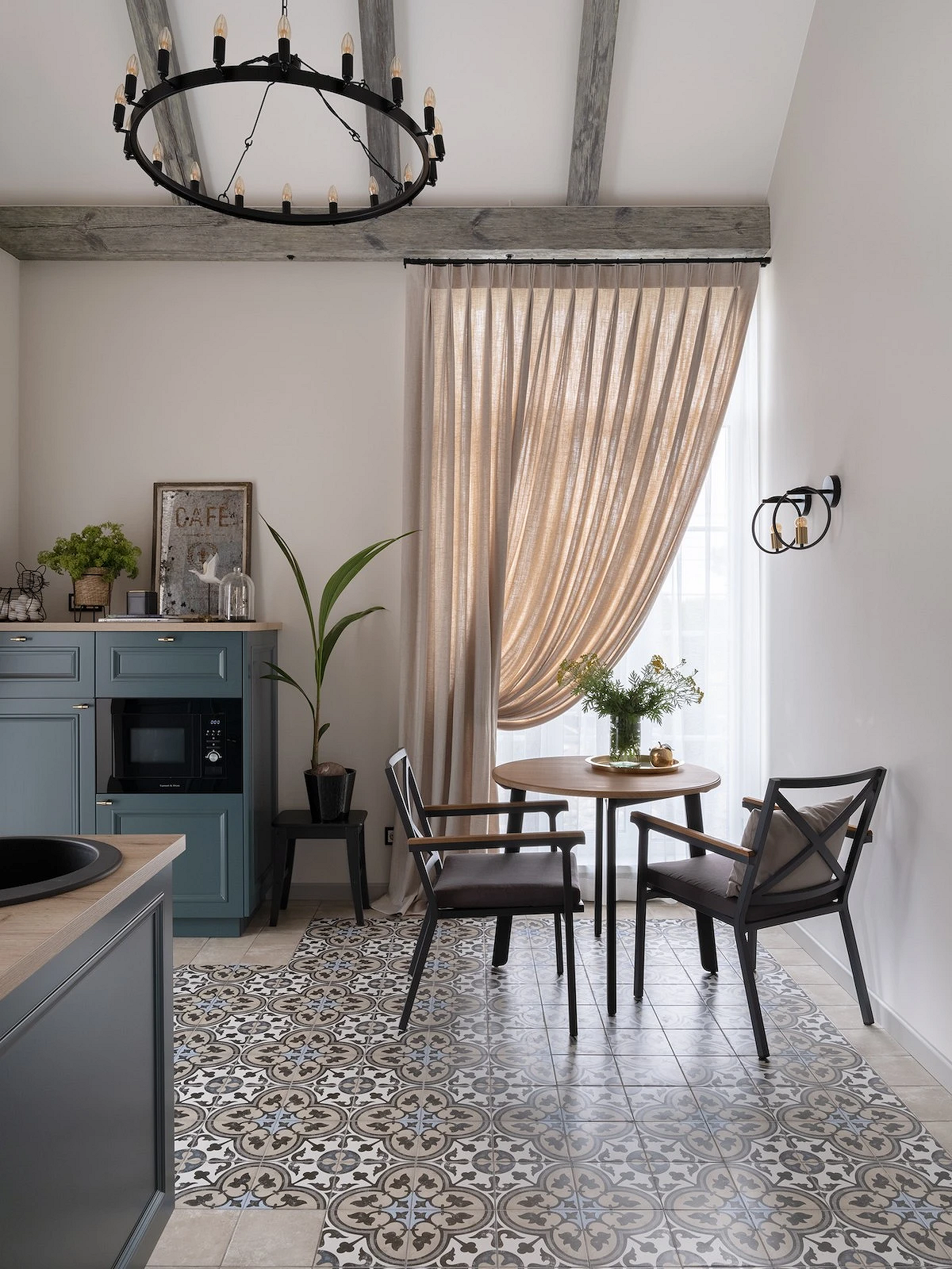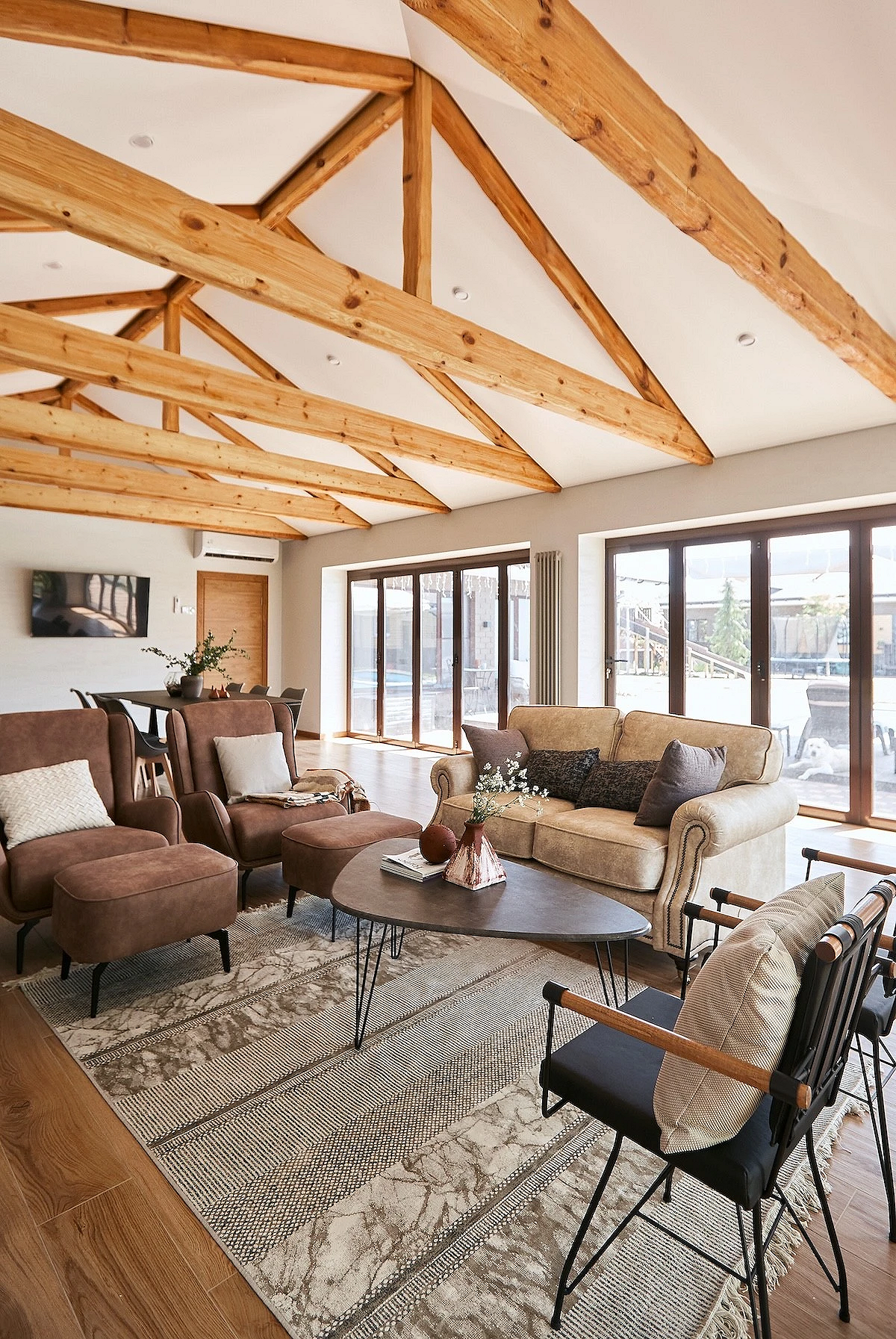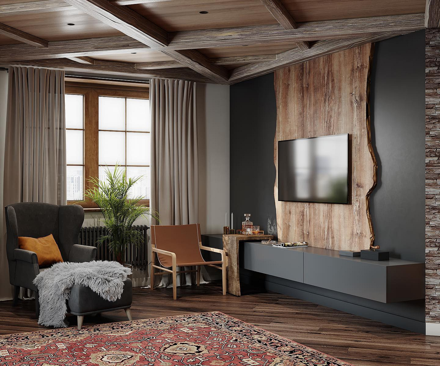 - Массивные конструкции — балки, толстые перекрытия и основательная мебель создают ощущение надежности. Даже декоративные элементы выглядят так, будто выполняют конструктивную функцию.