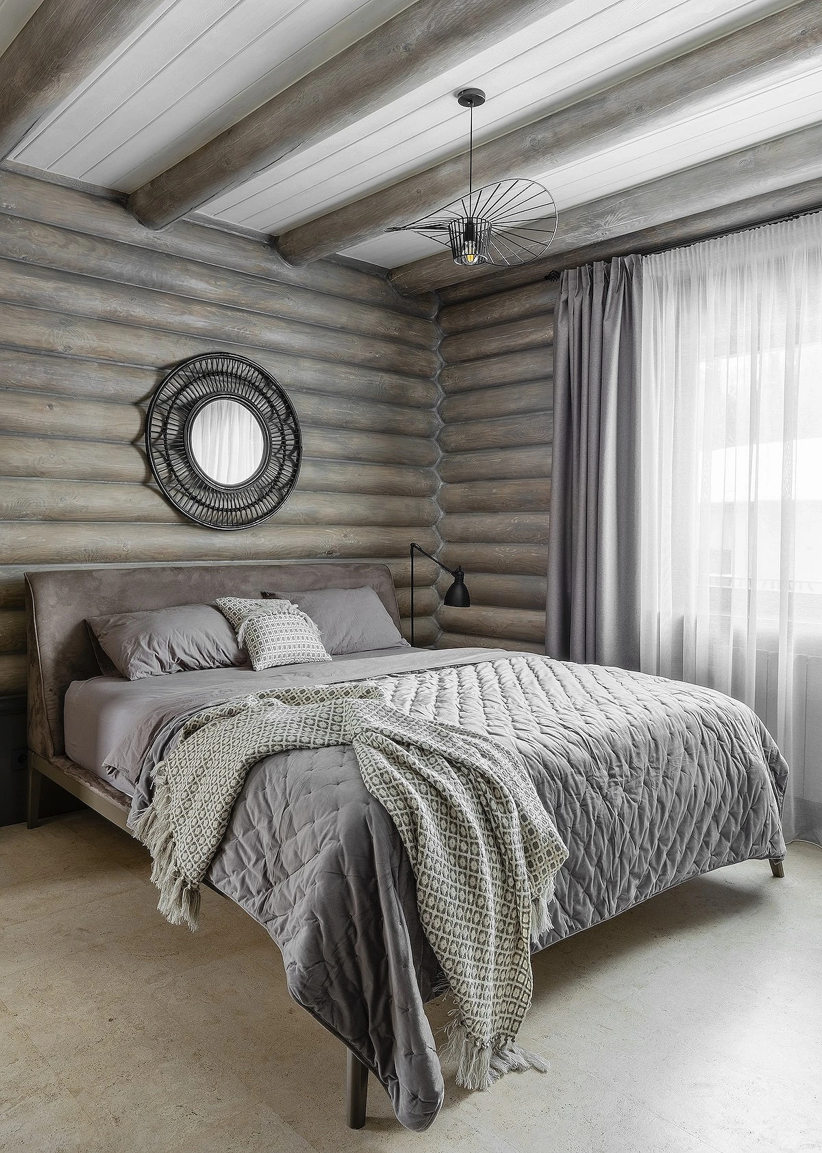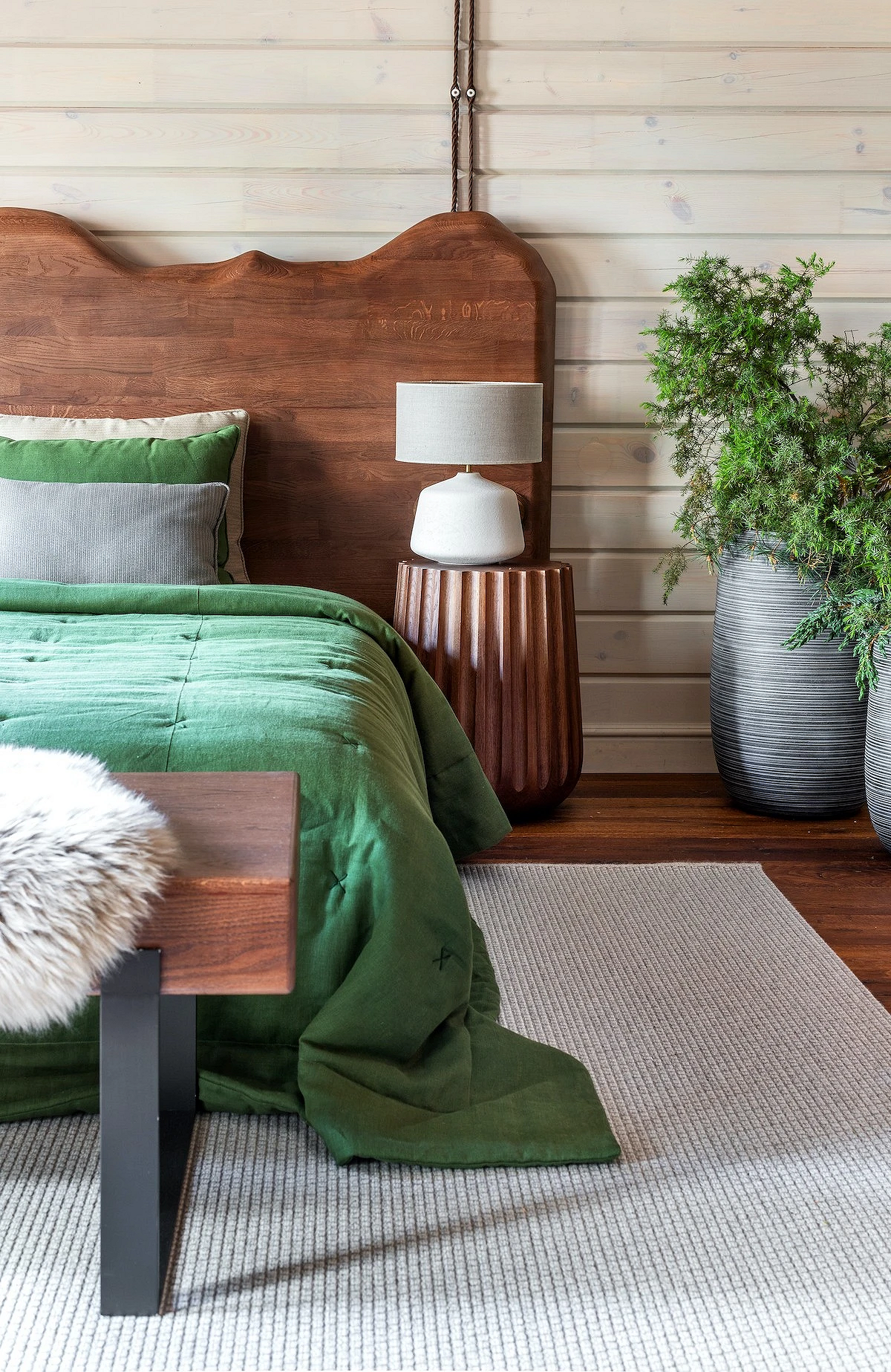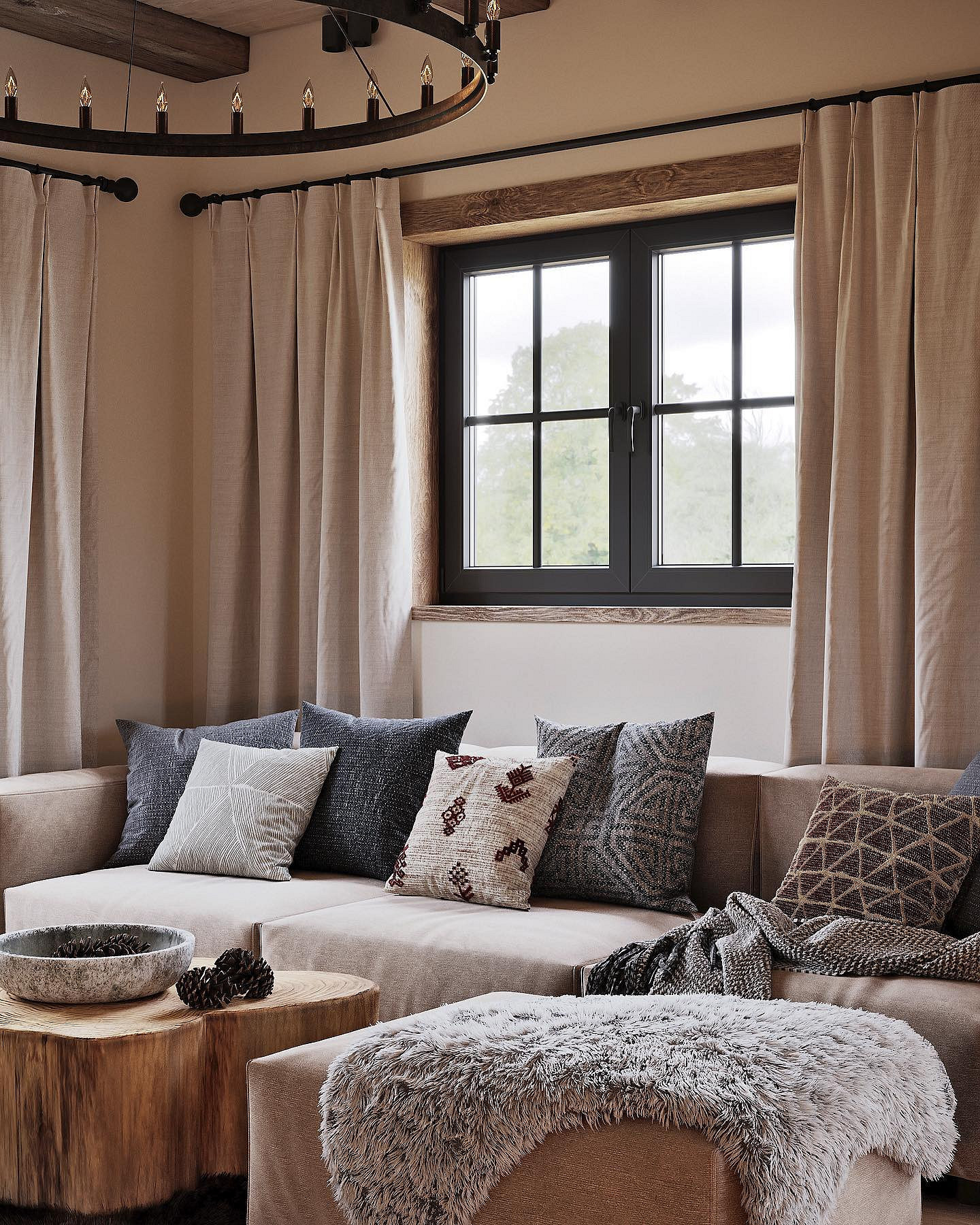 - Тактильность — чтобы сбалансировать грубые фактуры и массивные формы, а также добавить тепла, используют как можно больше мягких материалов: пледы, ковры, подушки, обивка мебели.