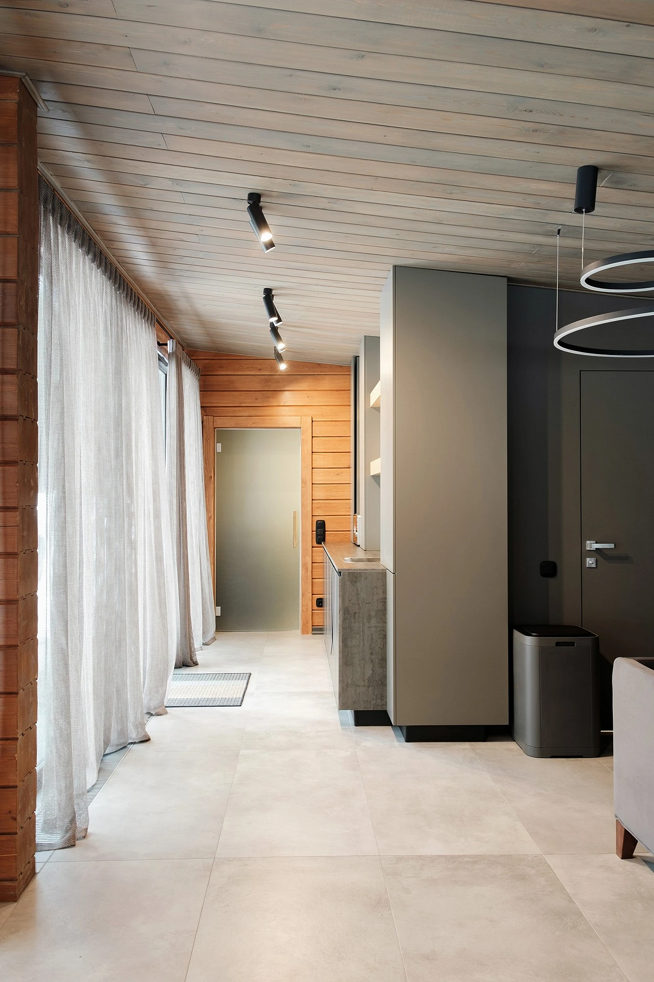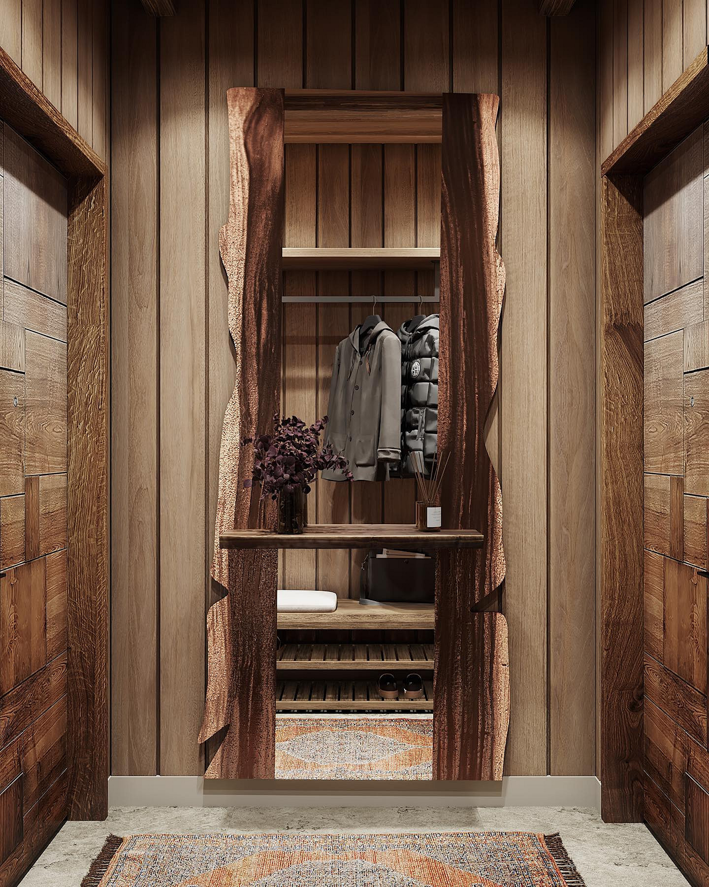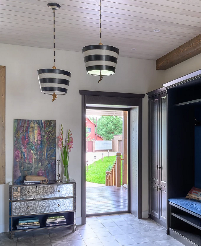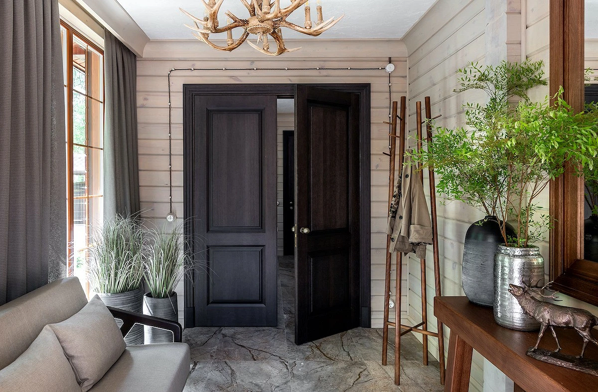Входная зона отвечает за первое впечатление о доме, поэтому в стиле шале она должна сразу создавать нужное настроение. Здесь уместны камень или керамогранит на полу, деревянные панели на стенах, массивные шкафы или вешалки из дерева.