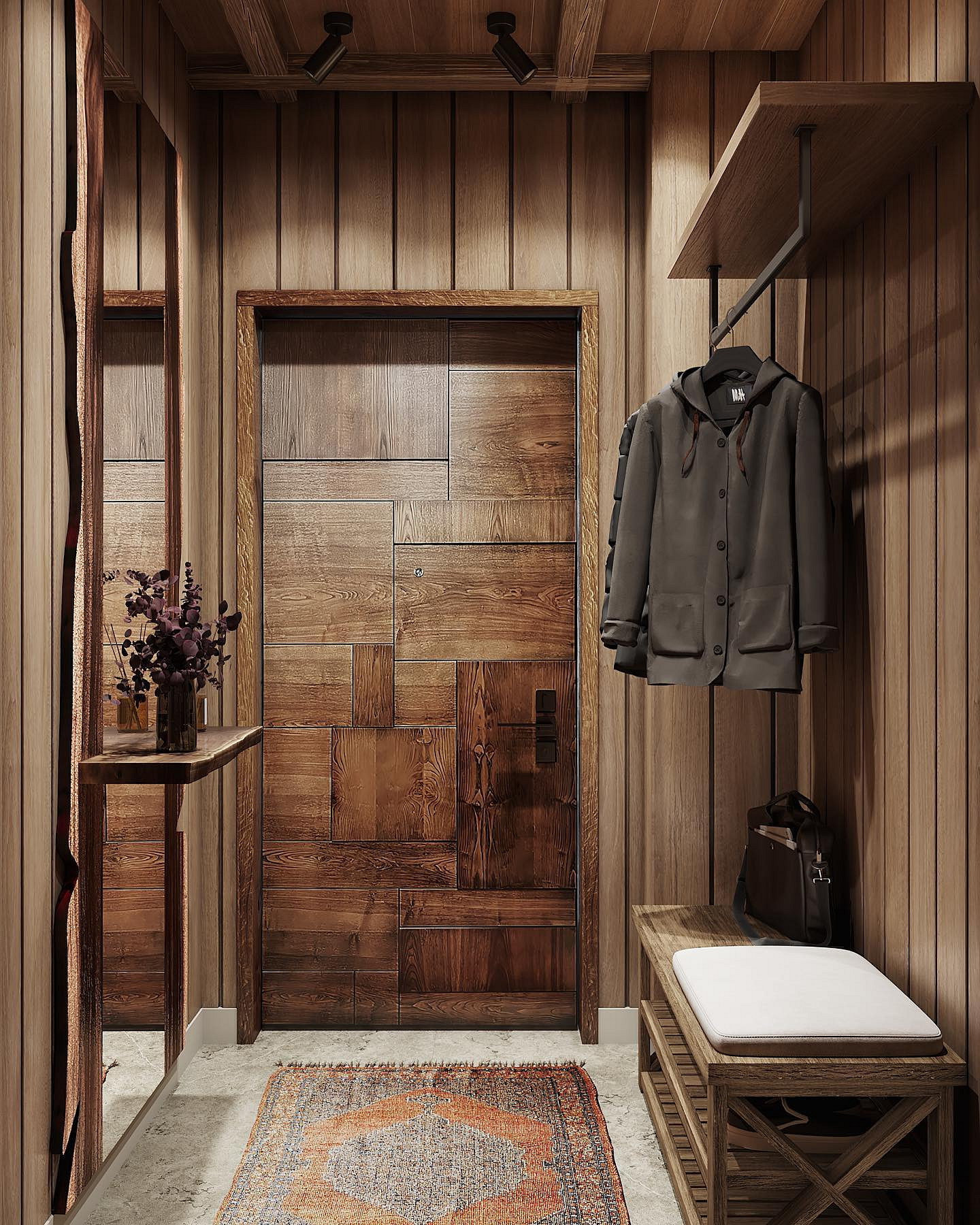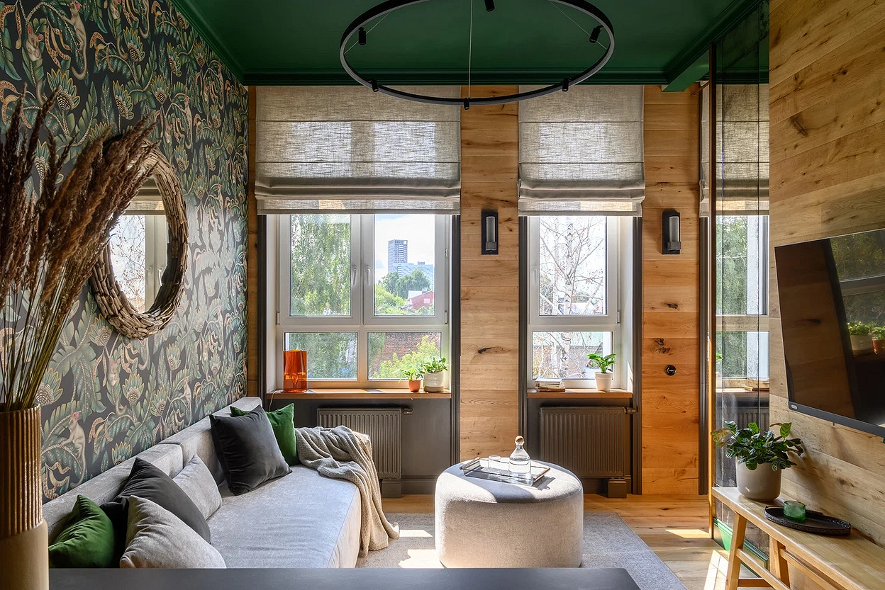 Отделка — максимально спокойная: дерево, краска или штукатурка теплых оттенков, минимум контрастов. Можно выделить акцентную стену панелями под дерево или камень либо текстурными обоями (лучше под покраску).