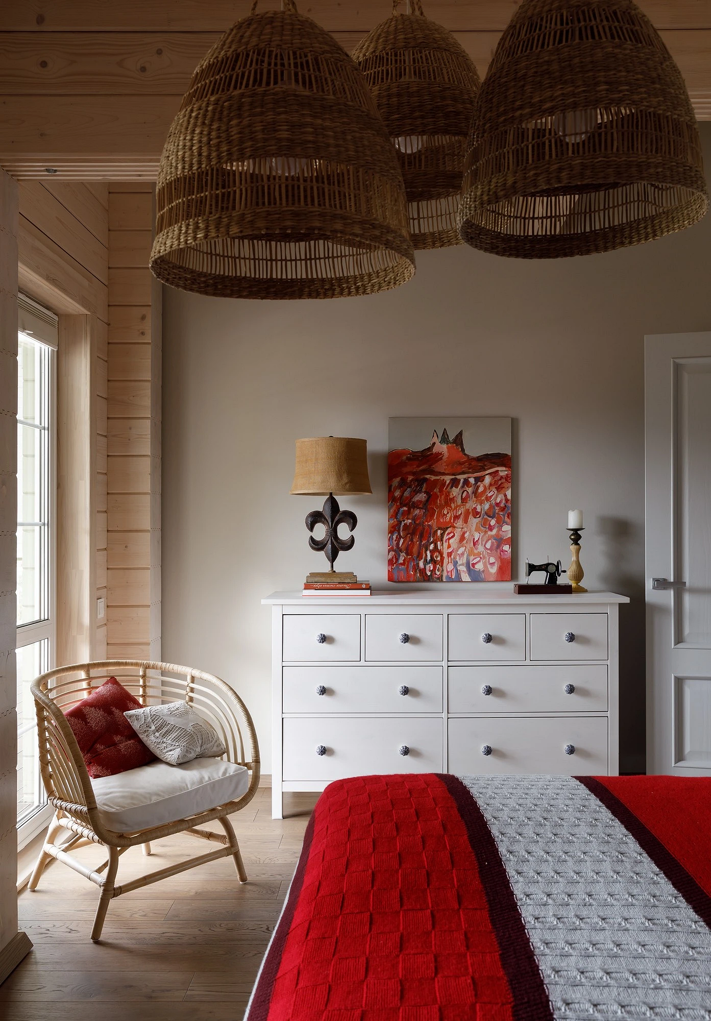 Декор должен поддерживать идею «дома в горах», но без очевидных клише. Отдавайте предпочтение простым и полезным вещам: керамике, деревянным подносам и шкатулкам, картинам и постерам в неброских рамах, растениям. Уютно смотрятся плетеные корзины, свечи разного размера, книги — чем больше, тем лучше. Не старайтесь заставить декором все поверхности, отдавайте предпочтение более крупным формам и выразительным фактурам.