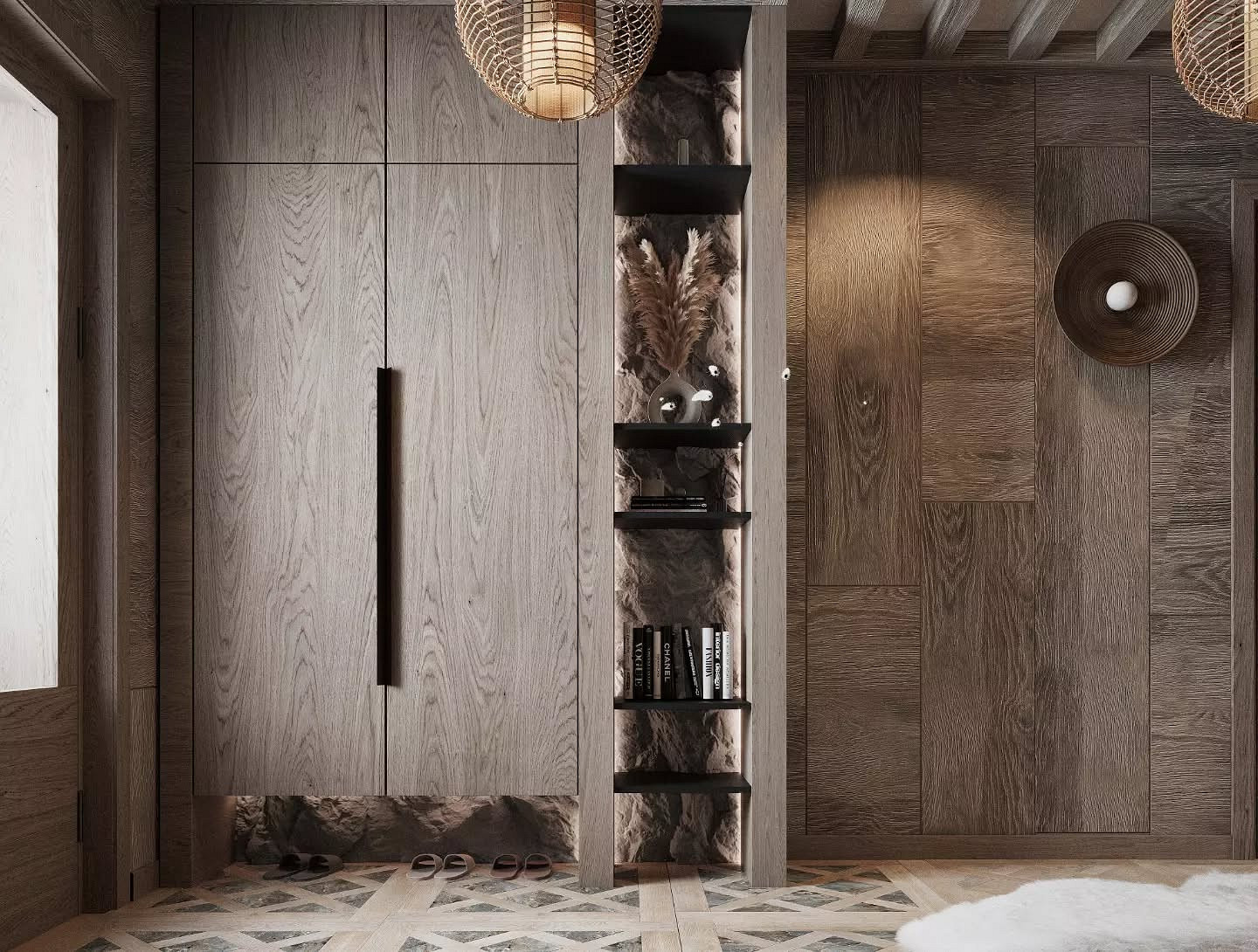 - Натуральные материалы — дерево и камень активно используют в отделке, мебели и декоре. Поверхности часто оставляют с выраженной фактурой, подчеркивая естественное происхождение материалов.