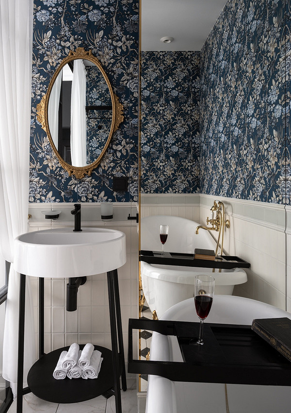 Красивые обои все чаще используют в ванных комнатах (на тех участках, куда не попадает вода), чтобы добавить в пространство уют и сделать санузел «жилой» комнатой по атмосфере. Но сегодня производители выпускают такие коллекции керамогранита, которые в укладке выглядят как обои — и их можно класть даже в тех участках, куда вода будет литься каждый день: в душевых, над ванной комнатой, за раковиной. В своем проекте дизайнер Екатерина Козлова выбрала именно такую коллекцию плитки: с рисунком птиц и цветов на синем фоне. Эту плитку уложили на верхнюю половину стены. Нижняя же оформлена белой мелкоформатной плиткой, уложенной вертикально. Граница очерчена бордюрами и горизонтально уложенной плиткой.
