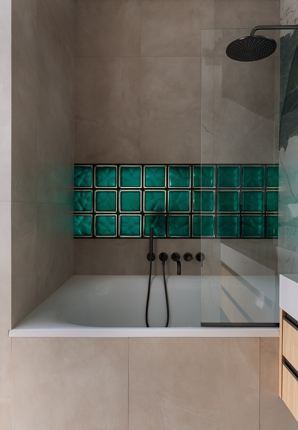 В ванной комнате в своей квартире дизайнер Светлана Тепфер применила один из любимых и эффектных приемов: выделение зоны раковины с тумбой с помощью стенок и акцентной отделки. В качестве основной отделки дизайнер выбрала недорогой крупноформатный керамогранит под камень светлого цвета, а в зоне раковины использовала мелкоформатную плитку изумрудного оттенка другого ценового сегмента — так как ее требовалось немного, получилось сэкономить.