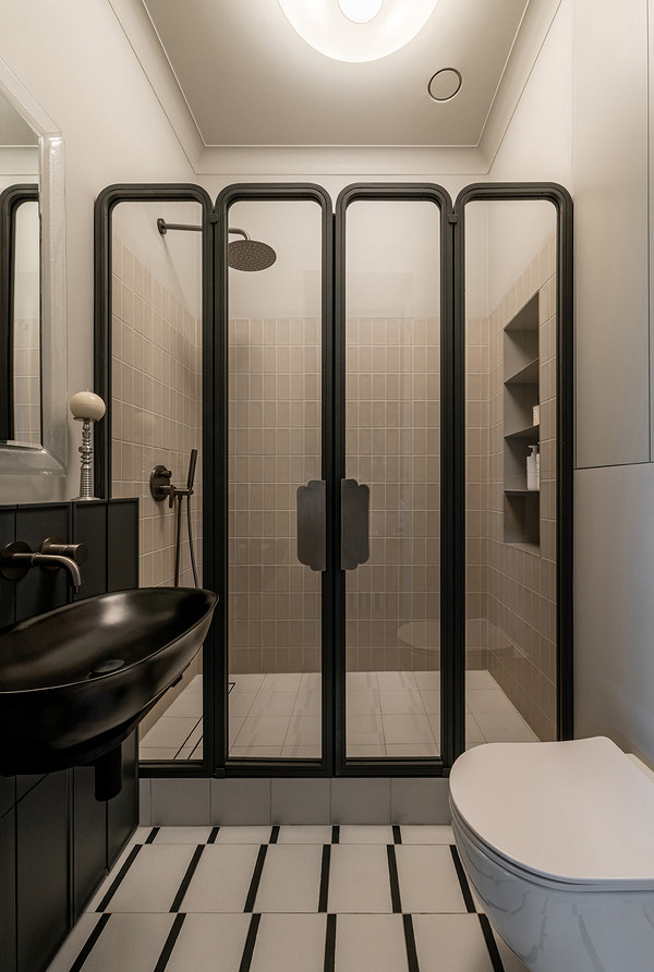 Иногда для акцента в интерьере достаточно одной необычной детали. Она может быть незначительной или, как в этом санузле по проекту Анастасии Сердюковой, объемным элементом — стеклянной перегородкой, без которой не обойтись в душевой зоне. Эту перегородку изготовили на заказ — четыре одинаковых овальных створки с закругленными краями, из них две — распашные дверцы. Перегородка полностью закрывает просторную душевую. Черный цвет перегородки дублируется в зоне раковины — сама чаша и стена за ней именно такого цвета.