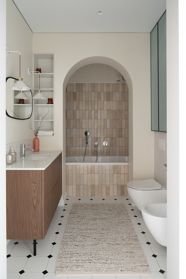 В проекте этой квартиры дизайнер Елена Максимова применила красивый и необычный прием в ванной комнате. Чаша ванны помещена в нишу с красивым арочным проемом. Такое решение приняли не только в целях создать визуальную красоту, но и чтобы обыграть коммуникации, расположенные в стене. Создание такой ниши позволило отказаться от стеклянной или обычной шторки — стекло не придется мыть, а шторку периодически стирать или менять. Арка — еще и зонирующий элемент этой вытянутой ванной комнаты.