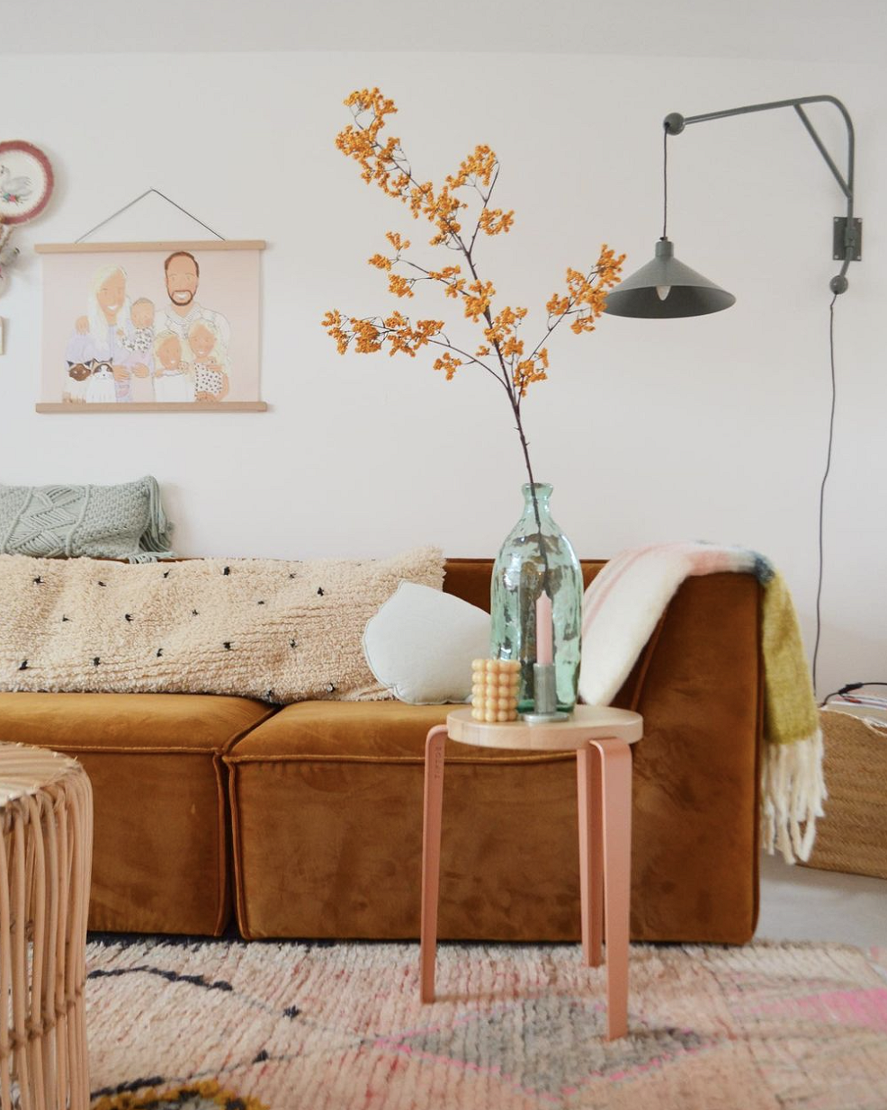 В этой гостиной главным акцентом стал крупный диван цвета охры. Он гармонично перекликается со стеной песочного оттенка и деревянной мебелью. Второе яркое пятно — небольшая софа мятного цвета. Но и это еще не все: третьим акцентным цветом выступает светло-розовый. Его вместе с мятным можно также найти в декоре: диванных подушках, подсвечниках, постерах на стене.