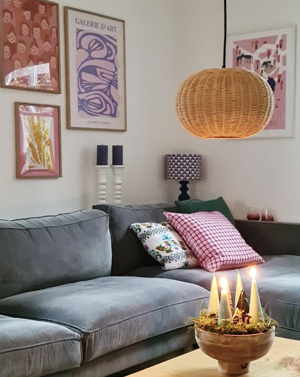 Если вы уже оформили нейтральный сканди-интерьер, это не значит, что нельзя сделать его ярче без ремонта. Например, в этой гостиной простые белые стены выступают фоном для серого дивана и деревянного журнального столика, но пространство выглядит интересно благодаря развеске из постеров на стене, вазам и диванным подушкам.