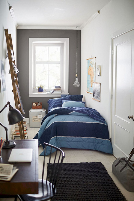 Сместите все важное ближе к окну. Поставьте вплотную к нему кровать, разместив ее поперек комнаты. Повесьте постеры или фотографии на стену, придвиньте комод или прикроватную тумбочку.