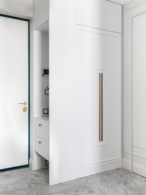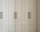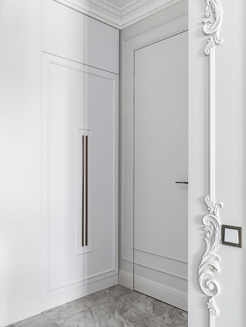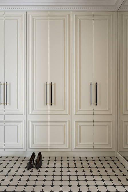 Фрезеровка на фасадах шкафов или на кухне стала привычным выбором. Сегодня же нередко можно увидеть другое решение — молдинги на фасадах. Дизайнеры выбирают его для интерьеров в классических стилях (неоклассика, французская классика и др.), чтобы создать пересечение с отделкой стен и потолка. Особенно эффектно смотрится одинаковая раскладка молдингов на стенах и шкафах, что буквально прячет большие системы хранения в интерьере. А еще интересно выглядит, когда молдинги делают по ширине двух распашных дверей и создают необычный геометрический рисунок.