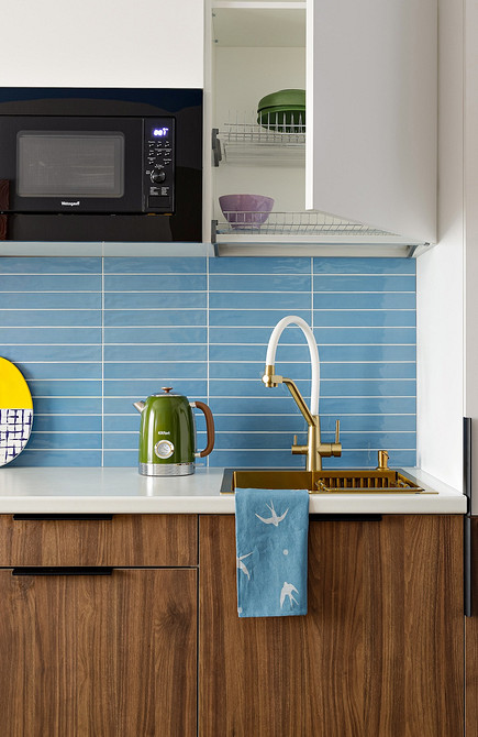 Белый, черный, серый, фактуры под мрамор и дерево — это база интерьера. Но сегодня все чаще появляются пространства, где дизайнеры экспериментируют с цветом плитки. Медовые оттенки на кухонном фартуке, когда плитка напоминает янтарь? Красивый винный цвет? Или яркий освежающий голубой? Яркая плитка может разнообразить интерьер кухни, сделать ее не банальной. Да, это не тот элемент, который легко поменять — выбирая яркую плитку, стоит оценить, готовы ли вы прожить с ней минимум 5-10 лет до нового ремонта.
