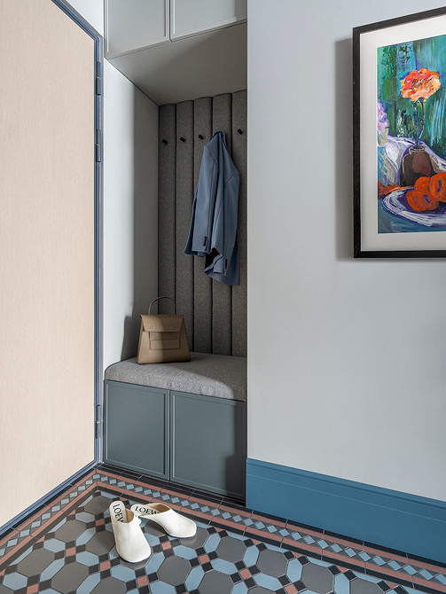 Если хочется добавить в интерьер цвета, чаще всего дизайнеры предлагают сделать это в прихожей. Это считается «безопасным» методом. В прихожей мы не проводим много времени, поэтому от цвета сложно устать. Зато «вау-эффект» при входе обеспечен каждый раз — и членам семьи, и гостям. Можно сделать акцентной только одну или две стены (чаще всего выбирают стену с входной дверью, и в таком случае дверь тоже надо покрасить или заказать цветную накладку, окрашенную на производстве), или же выделяют цветом всю входную зону, включая потолок. Получается эффект «шкатулки».