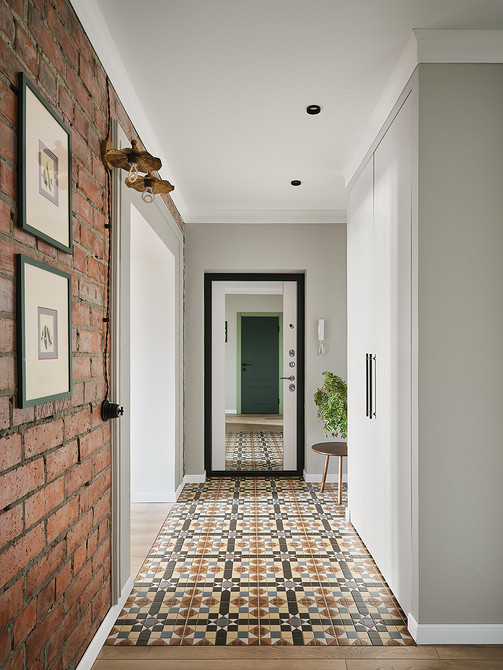Классика, которая стала трендом и даже признаком интерьера «вне времени». Такая отделка уместна практически в любом стиле. Современный она сделает интереснее, добавит элемент истории. А классику подчеркнет. Чаще всего для создания такой отделки дизайнеры выбирают метлахскую плитку (ее современные аналоги). Это может быть в буквальном смысле «ковер» — то есть выложенный рисунок в рамочки из плитки. Или просто рисунок, без рамки. В любом исполнении выглядит интересно и роскошно.
