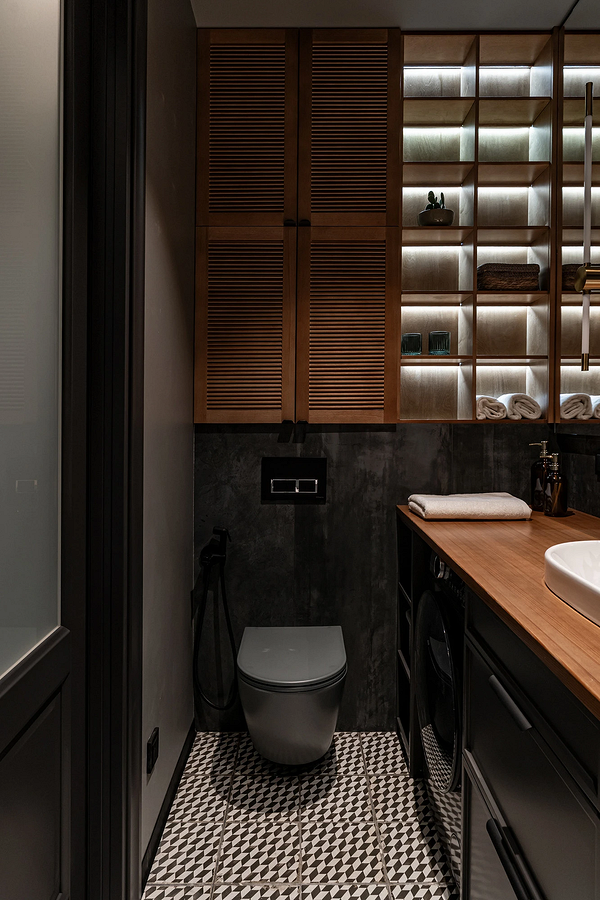 Темная матовая сантехника выглядит очень эффектно и зачастую становится главным акцентом в санузле. Это беспроигрышный вариант для стилей лофт или контемпорари, где важна контрастность деталей. Главная проблема обнаруживается в процессе использования: налет и белые разводы от воды на черном фоне видны гораздо отчетливее, чем на стандартном хроме. Чтобы сантехника сохраняла первозданный вид, ее придется постоянно протирать салфеткой из микрофибры.