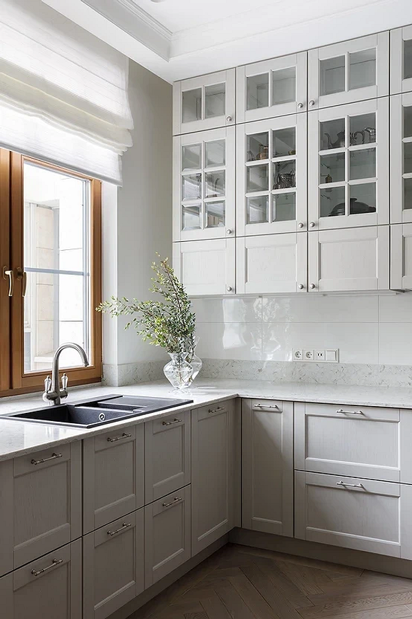Отказ от верхних модулей гарнитура в пользу открытых полок делает кухню визуально легче и просторнее. А красивая посуда и баночки со специями на виду становятся функциональным декором, который придает помещению уютный обжитый вид. Однако в быту решение требует железной дисциплины: любой хаос на полках мгновенно превращается в визуальный шум. Помимо этого, открытые поверхности в зоне готовки быстро покрываются жирным налетом и копотью, поэтому протирать все содержимое придется еженедельно.