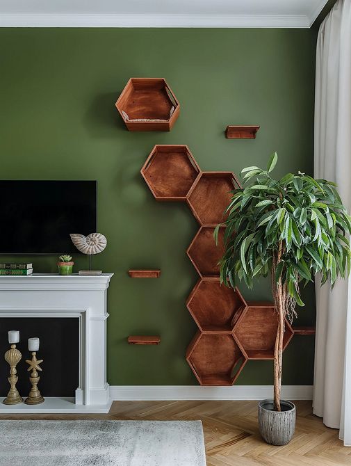 Полки в гостиной помогут и организовать хранение, и уравновесить пространство. Потому что пустые стены в сочетании с крупной и низкой мебелью (диванами, креслами, тумбами и комодами) смотрятся плохо.