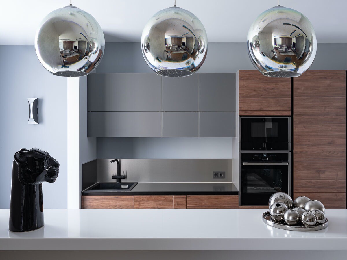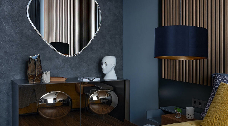 Основная цветовая гамма — сложные оттенки серого: от выбеленного до цвета «мокрый асфальт». Чтобы смягчить брутальный цвет, использовали фактуру дерева.