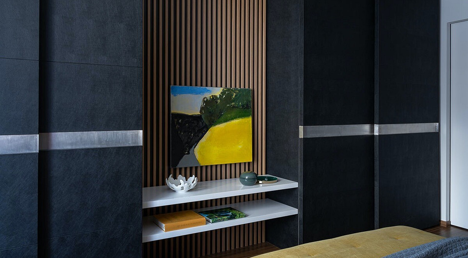 Предметы мебели выглядят лаконично, но не скучно. Например, необычный фасад комода в спальне напоминает куски помятого стекла. Фасады шкафов там же обтянуты кожей.