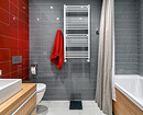 Гостевой санузел с душевой кабиной в строительном исполнении может также служить детским, когда малыш станет более самостоятельным. Компактное подстолье умывальника предназначено для хранения необходимых принадлежностей. Для отделки стен выбрана некрупная прямоугольная плитка без орнамента, трёх оттенков (красная, бирюзовая и бежевая), которые используются в оформлении остальных помещений