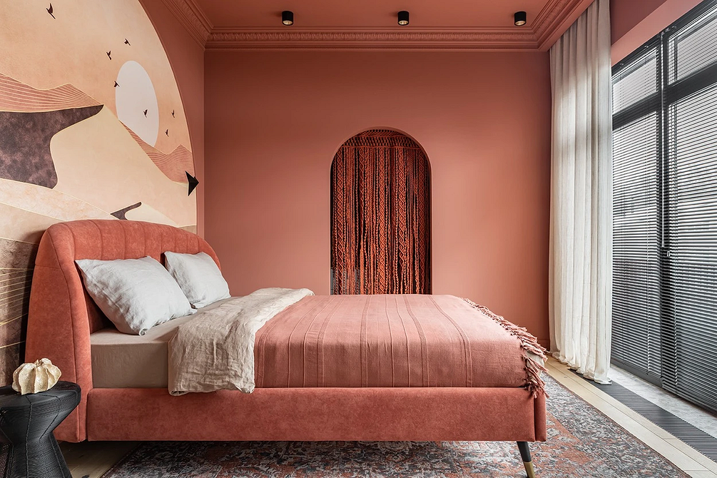 Прием сейчас очень популярен, его часто применяют в бюджетном ремонте или хоумстейджинге, когда нужно добиться выразительности за минимальные деньги. Иногда покраску дополняют тонкой гипсовой рамкой в форме арки — чтобы стена выглядела более объемной.
