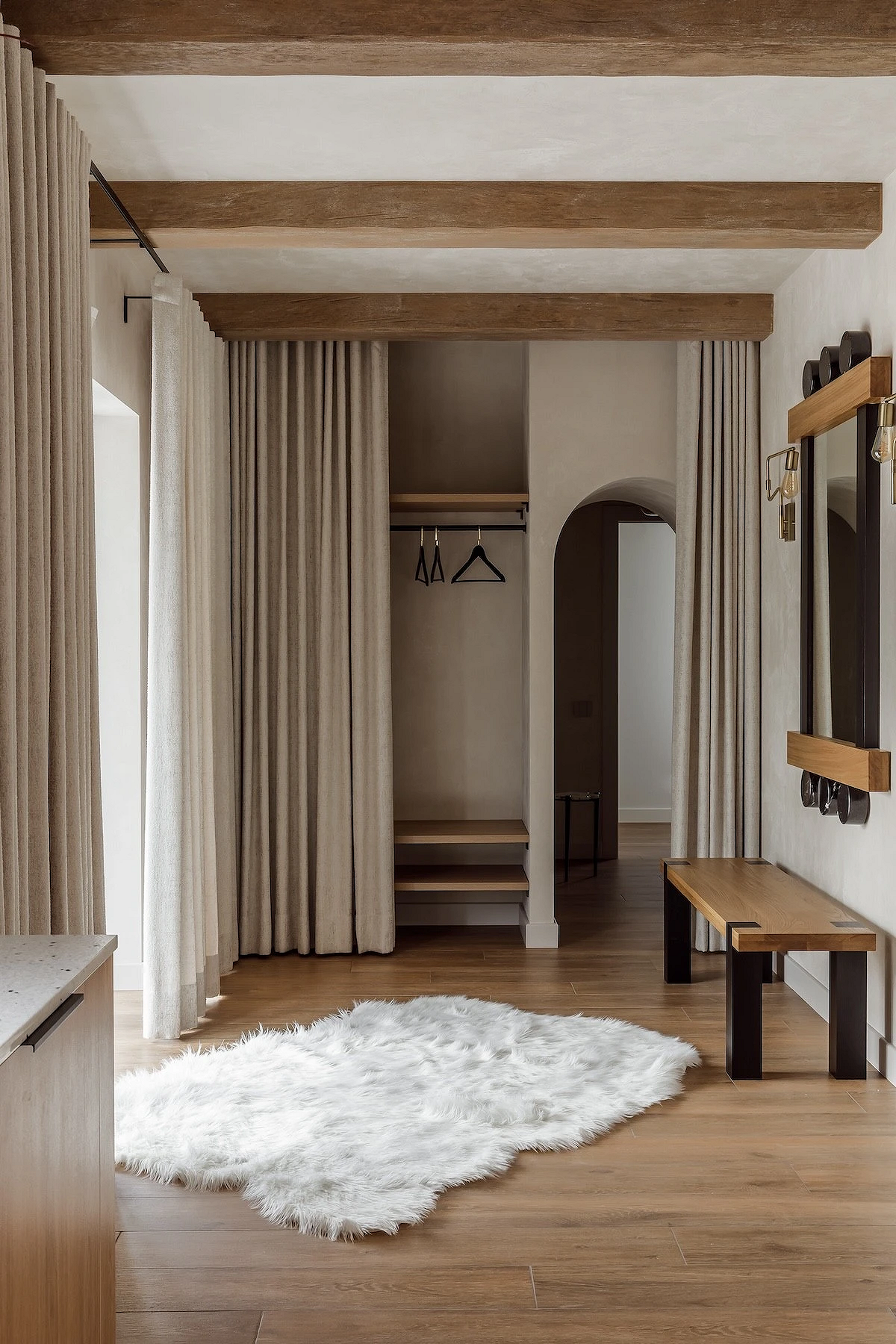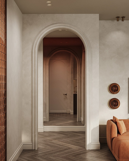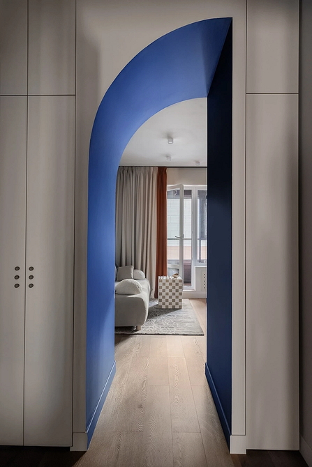 В таком оформлении архитектурный элемент не бросается в глаза, но при этом красиво меняет пространство. Это хороший вариант для маленьких квартир или если вы оформляете арочный проем в дополнительное помещение: например, из спальни или прихожей в гардеробную (в этом случае проход еще можно закрыть шторой).
