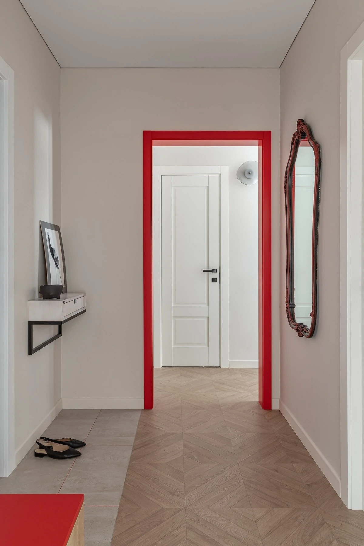 - Покраска — самый простой и бюджетный способ. Проем можно покрасить в тон стен или в контрастный оттенок. Цветовой акцент между помещениями — спасение для маленького пространства, поскольку обилие декора в нем нежелательно. Для глянцевой поверхности выбирайте алкидную краску, для матовой — водно-дисперсионную.