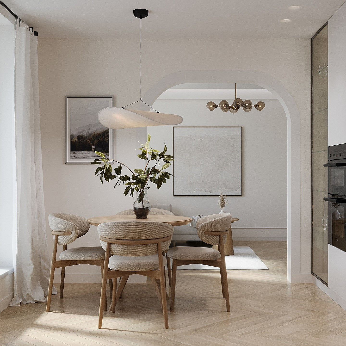 Отсутствие ярких цветов и узоров в этом строгом, лаконичном минимализме компенсируется акцентами на фактурах и формах. Поэтому арочные проемы классической округлой или прямоугольной формы хорошо смотрятся в таких интерьерах. Добавляют графичности или, наоборот, сглаживают строгую геометрию мебели, подчеркивают мягкие линии других предметов.