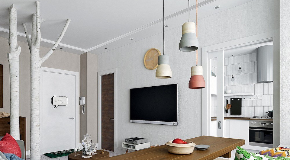 Колоннада из стилизованных берёз — главный элемент интерьера комнаты. «Берёзовая аллея» — это не только арт-объект, но и сквозная перегородка, зонирующая пространство на прихожую и гостиную. Фотопанно с изображением берёзовой рощи дополняет «природную» тему, создаёт ощущение глубины и вызывает положительные эмоции.
