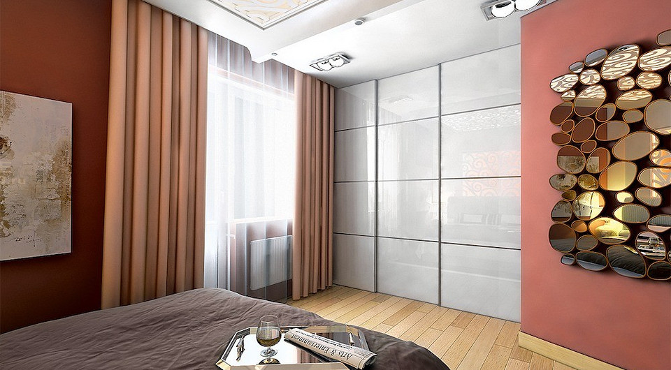 В спальне задействовано большинство участков стен, самые узкие простенки окрашены в нейтральный кофейный цвет