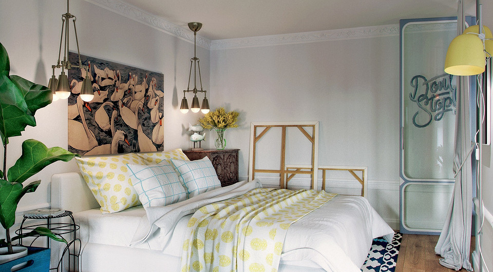 Витражное остекление предусмотренной проектом оригинальной столярной перегородки обеспечит хорошую инсоляцию спальни. Однако на окнах будут плотные шторы — на случай, если потребуется полное или частичное затемнение.