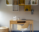 Функционально детская разделена на три зоны: сна, учебы и хранения. Стены оформлены обоями нежного персикового оттенка. Рабочее место выделено другим цветом — в бежевом оттенке с контрастным синим кантом.