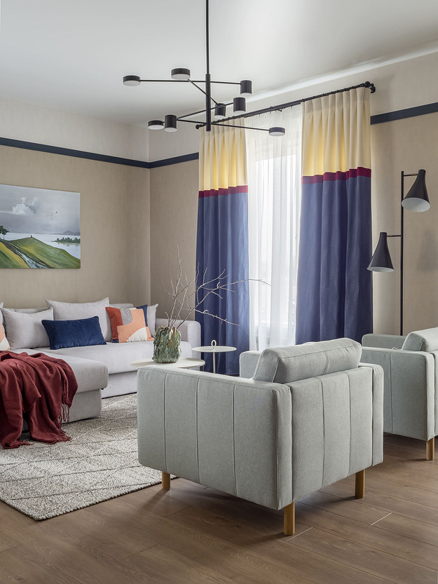 Комната воспринимается скорее как зона отдыха за счет большой диванной группы: здесь есть угловой раскладной диван (на нем может разместиться бабушка на случай ночевки), два кресла, журнальные столики.