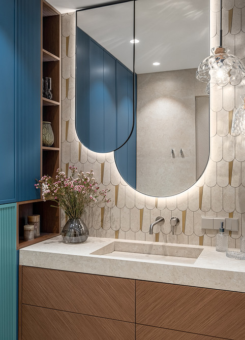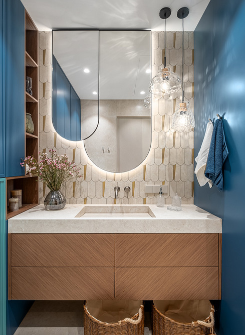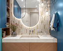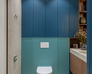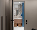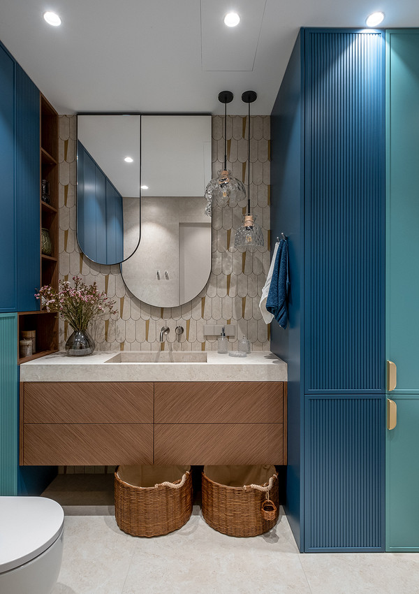 В ванной комнате предусмотрели впечатляюще много хранения. Это и тумба под раковину с четырьмя выдвижным ящиками, и шкафчик над инсталляцией, который также продолжается в зоне раковины (там предусмотрены открытые полки), и шкаф, куда прячутся стиральная и сушильная машины.