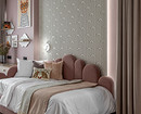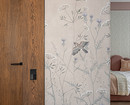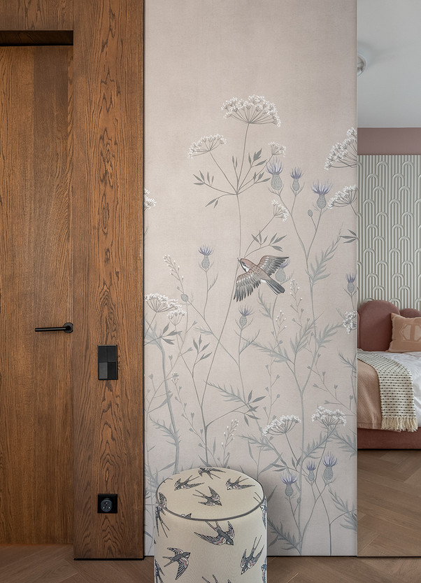 Кроме краски, стены украшает и другая отделка: шпонированные панели, которые использовали в отделке прихожей, объемные панели с рисунком в изголовье кровати в детской и обои с цветочным узором на другой стене там же.