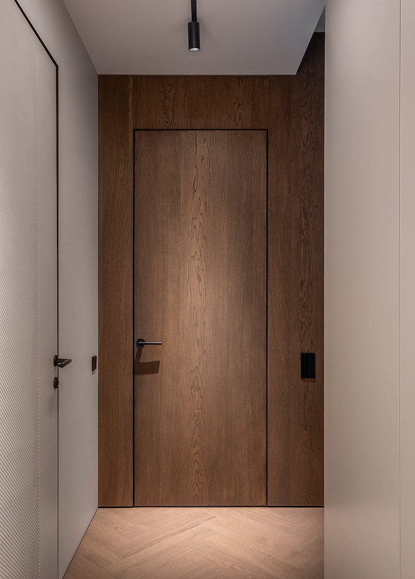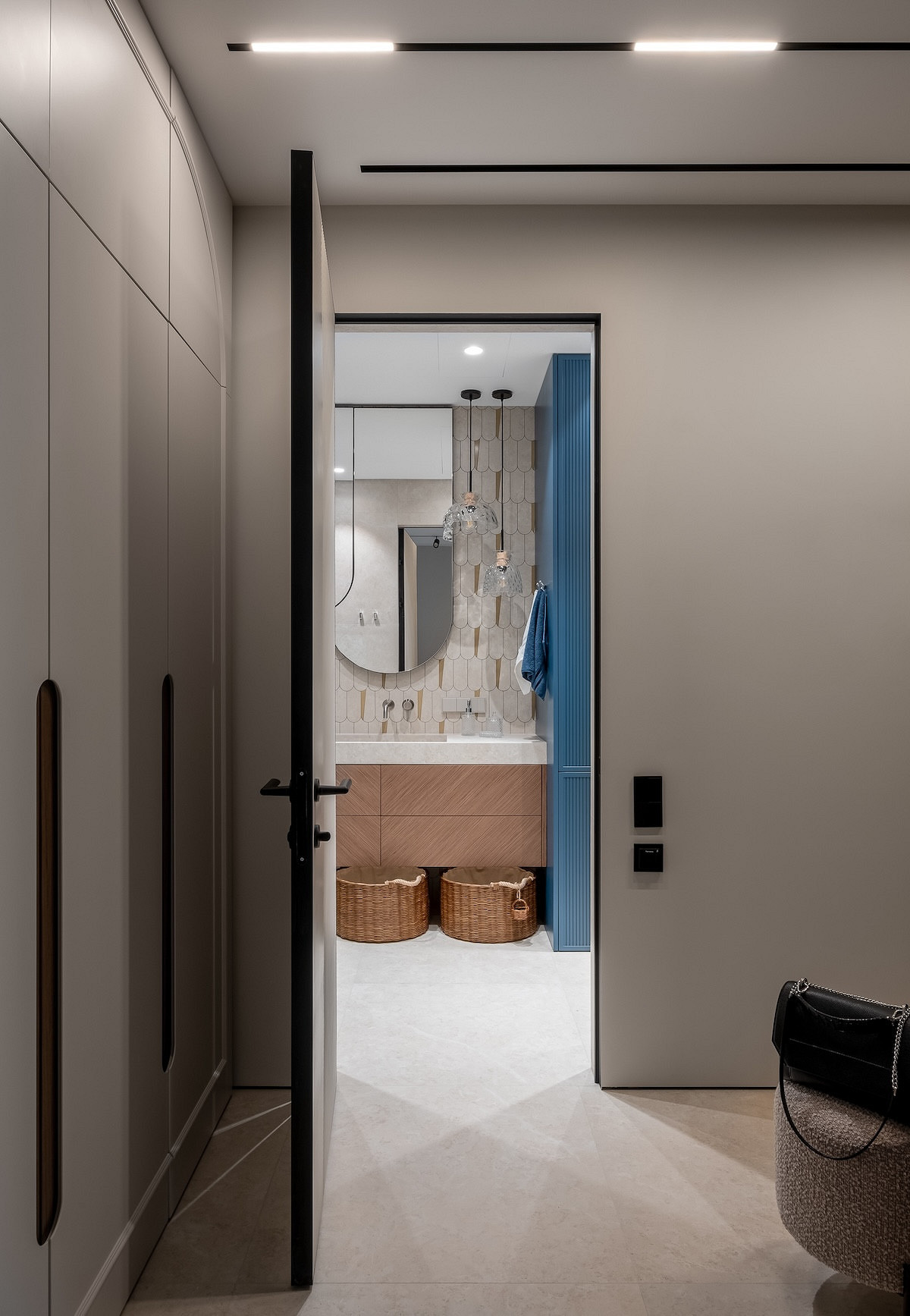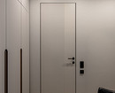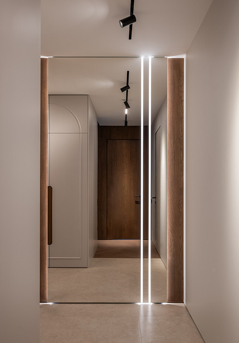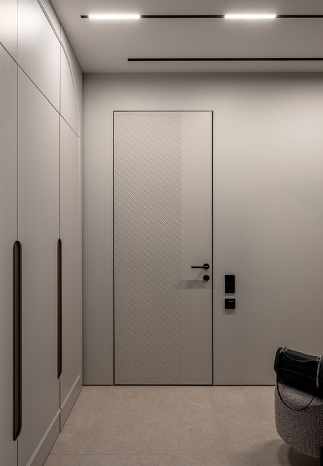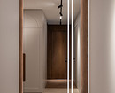 В коридоре — встроенный шкаф для верхней одежды, обуви. На фасадах шкафа — молдинг в форме арки, ему же вторит форма ручек.